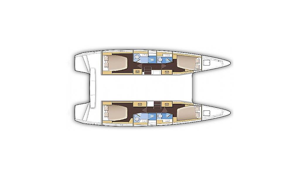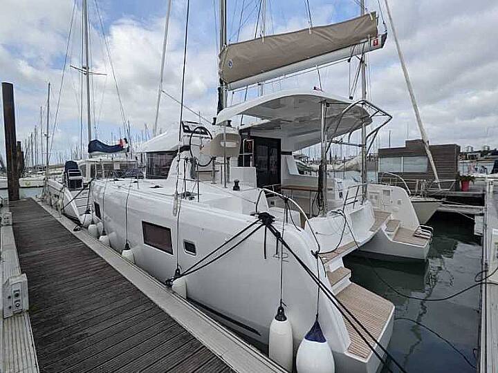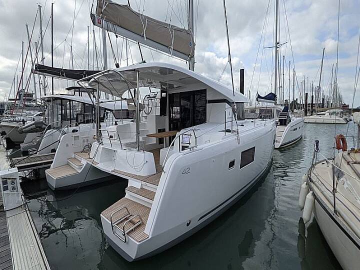 Katamaran Lagoon 42 Ria III, Baujahr 2021, liegt im Lefkas, D-Marin, Ionisches Meer, Griechenland vor Anker. Es verfügt über 4 + 2 Kabinen und bietet Platz für 8 + 2 + 2 Personen mit 4 + 1 Toiletten.