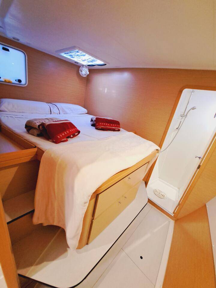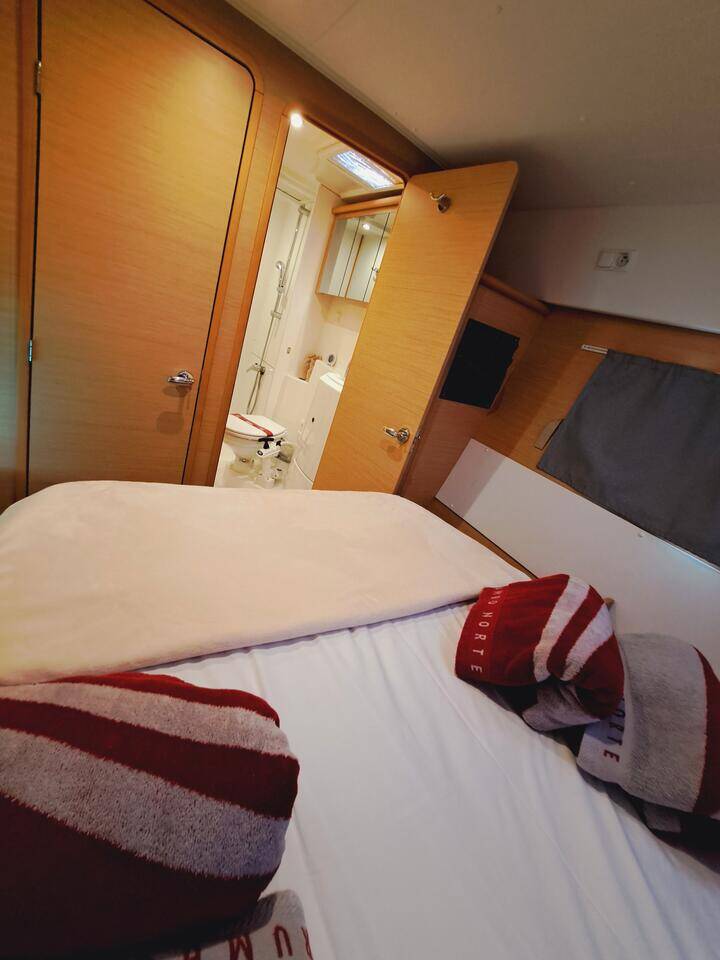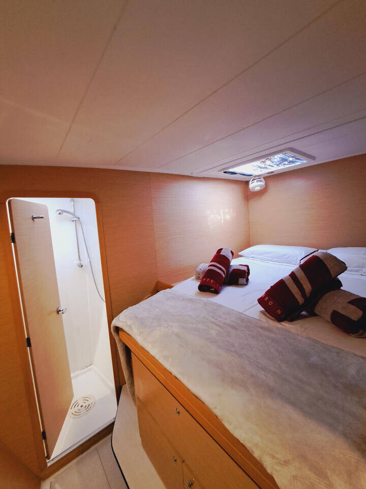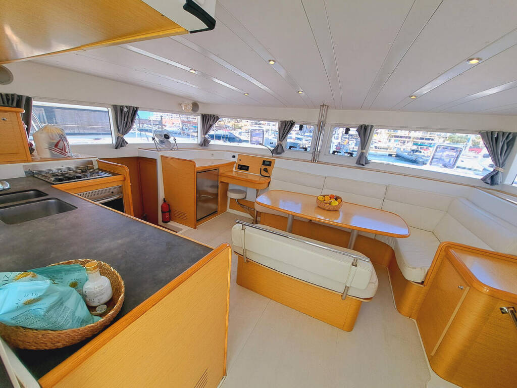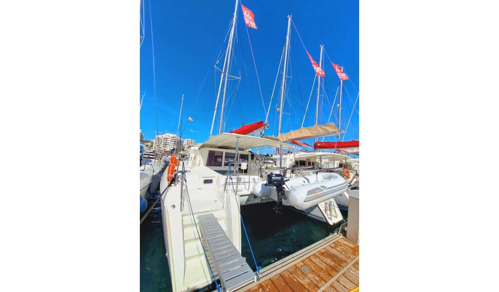 Katamaran Lagoon 421 The Mob, Baujahr 2015, liegt im Ibiza, Club Nàutic Sant Antoni de Portmany, Balearische Inseln, Spanien vor Anker. Es verfügt über 4 + 2 Kabinen und bietet Platz für 8 + 2 + 2 Personen mit 4 Toiletten.