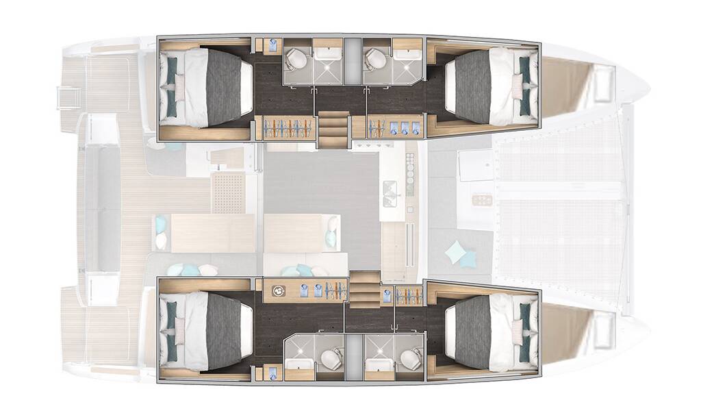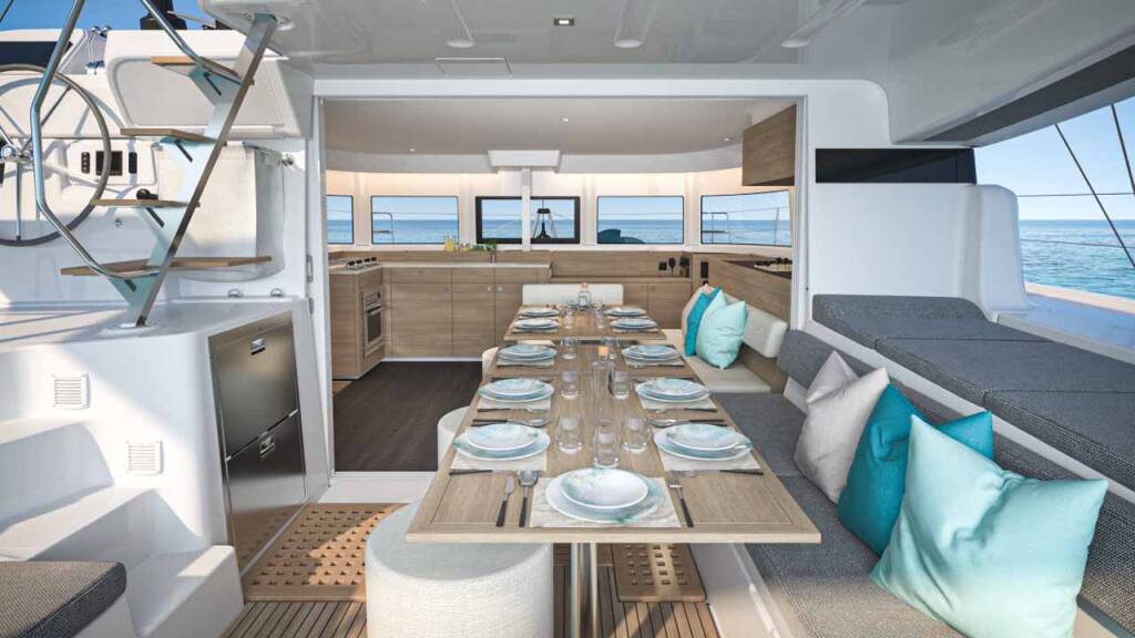 Katamaran Lagoon 43 Sail la vie, Baujahr 2026, liegt im Marina Mandalina, Sibenik, Sibenik & Umgebung, Kroatien vor Anker. Es verfügt über 4 + 2 Kabinen und bietet Platz für 8 + 2 + 2 Personen mit 4 Toiletten.