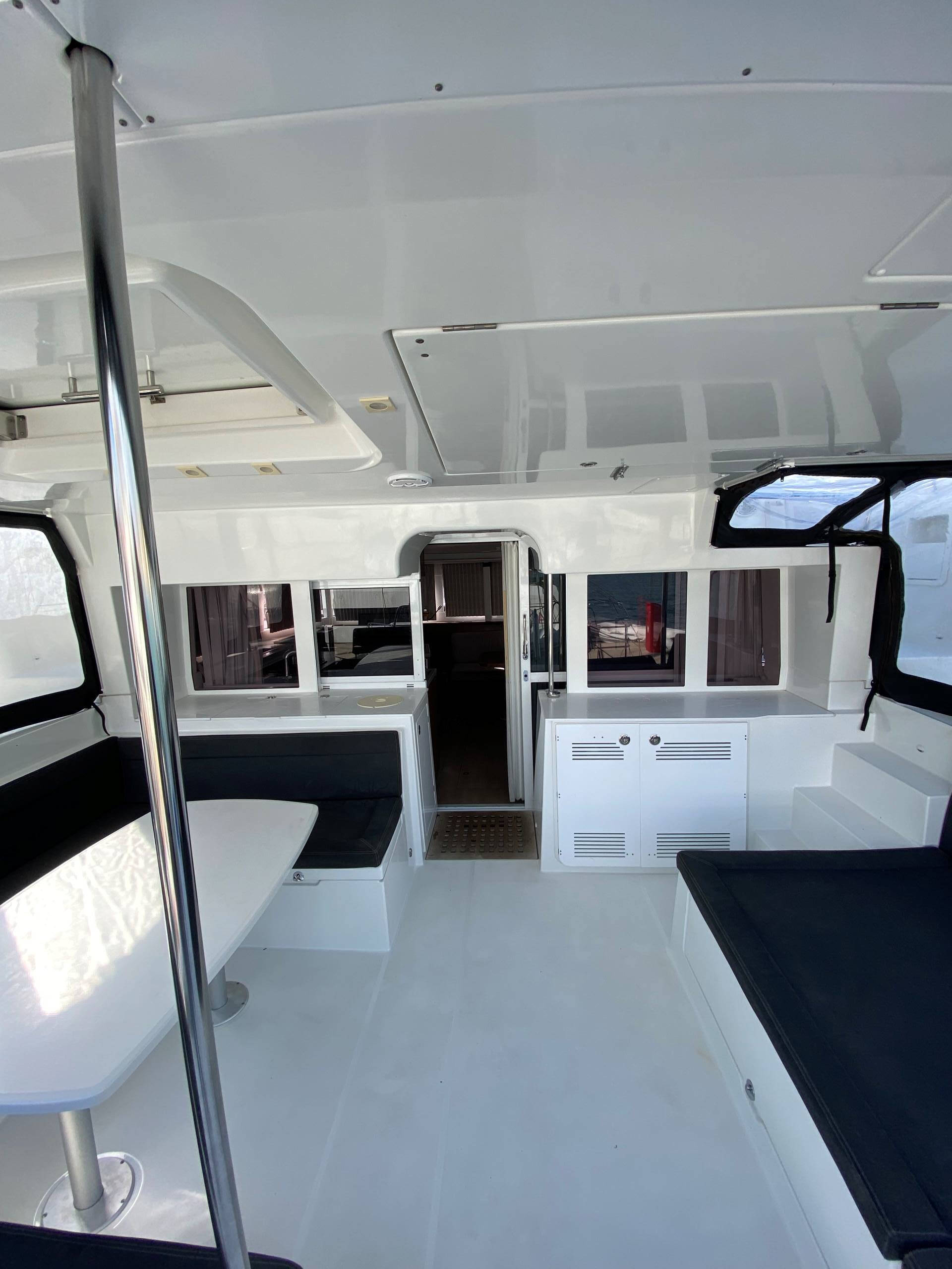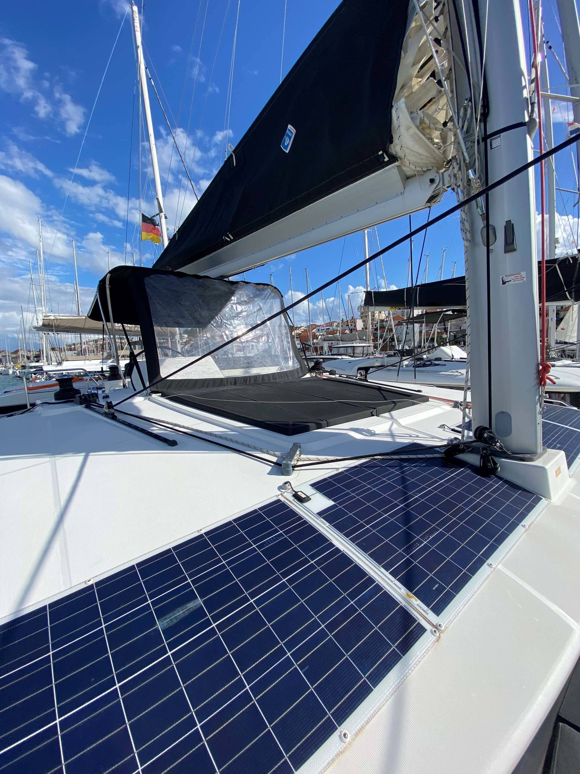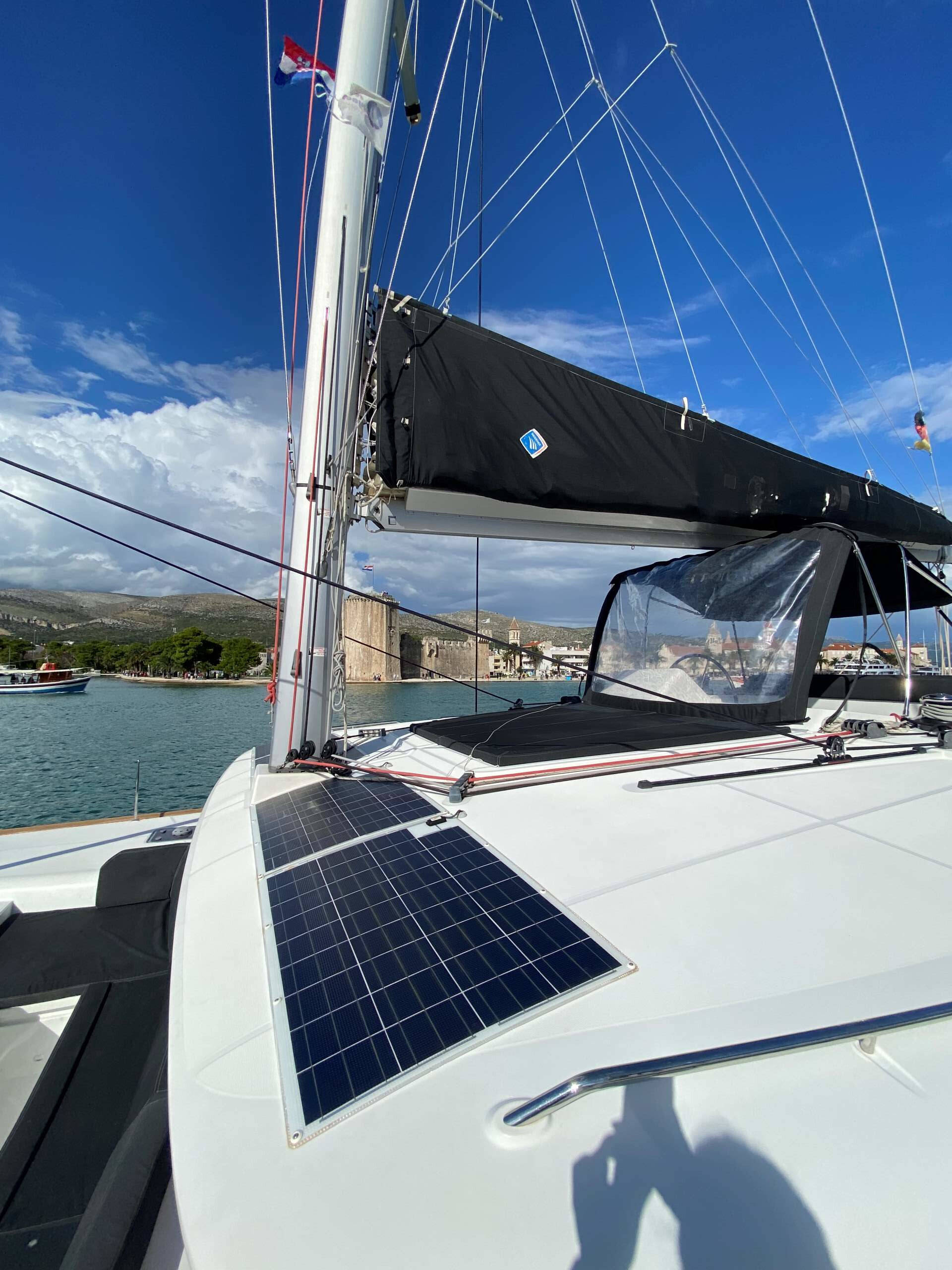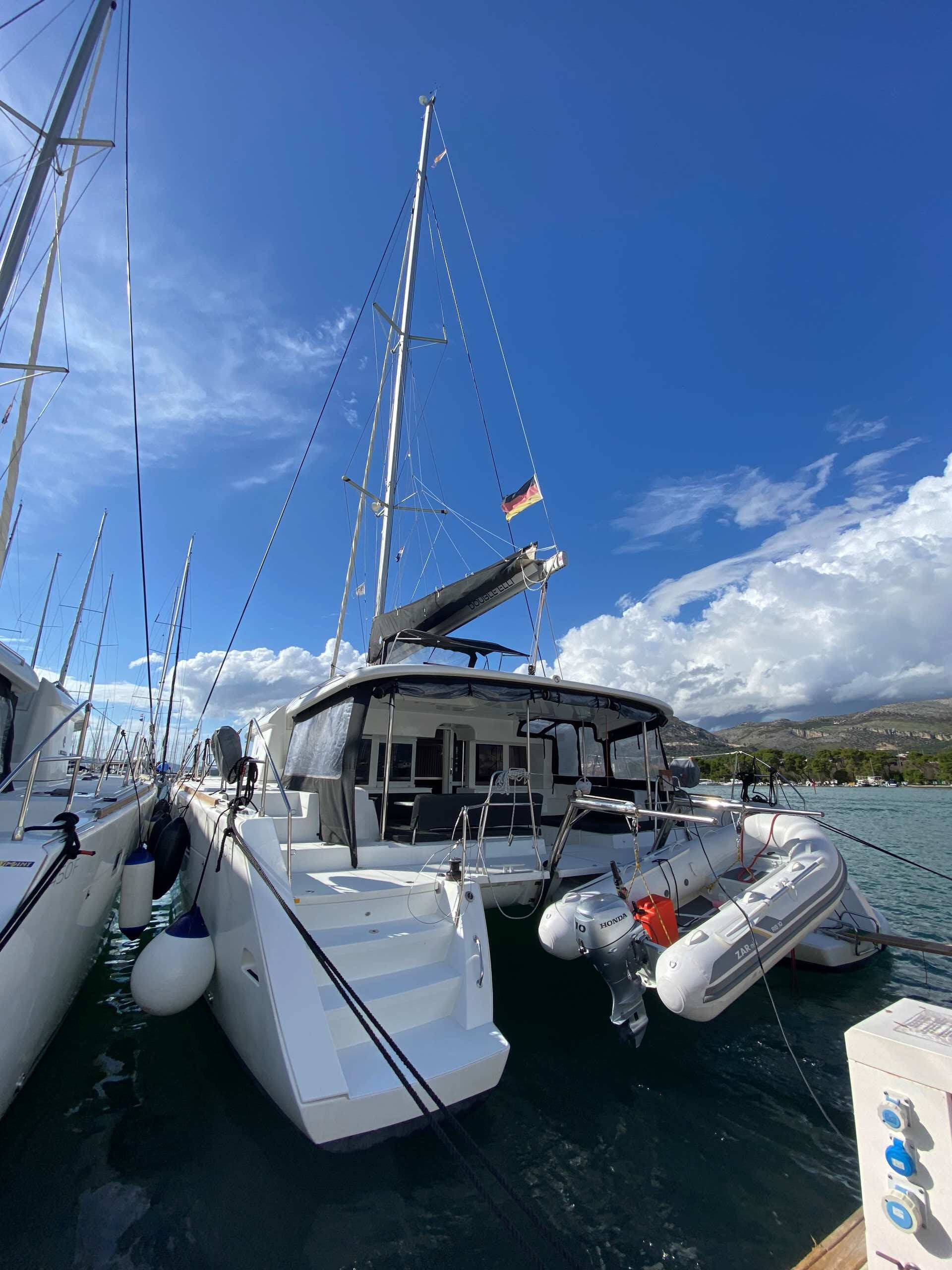 Katamaran Lagoon 450 F Double elli, Baujahr 2020, liegt im ACI Marina Trogir, Split & Umgebung, Kroatien vor Anker. Es verfügt über 4 + 2 Kabinen und bietet Platz für 8 + 2 + 2 Personen mit 4 Toiletten.