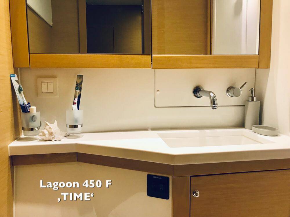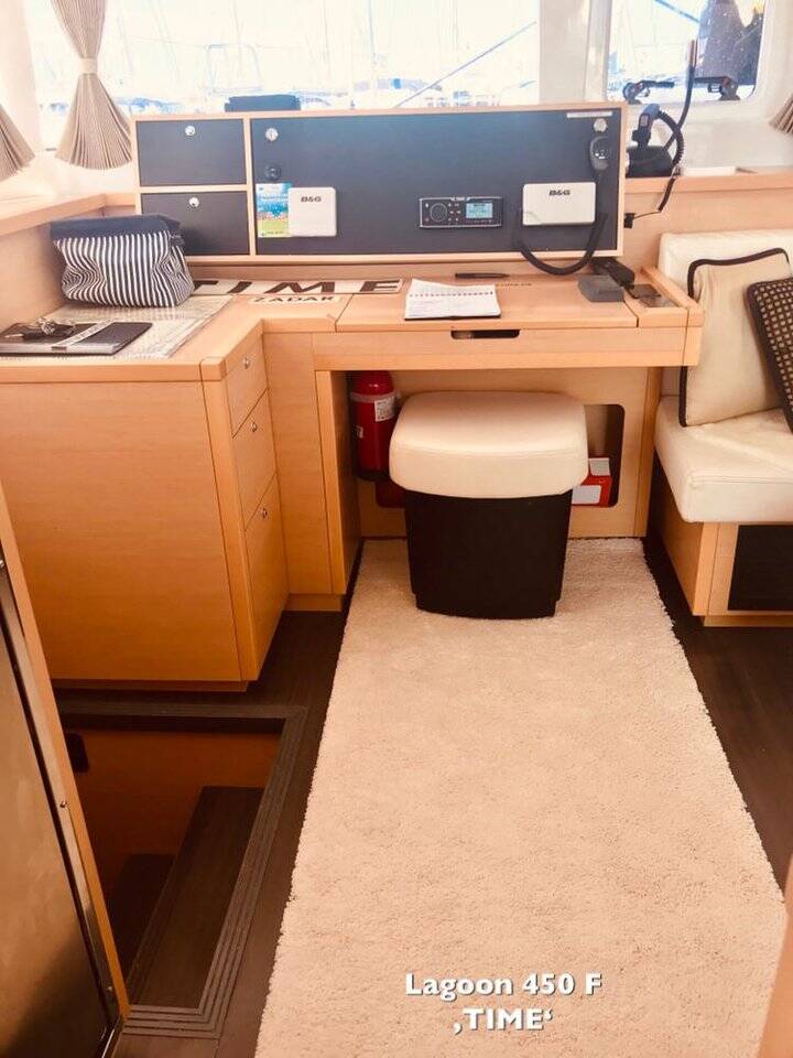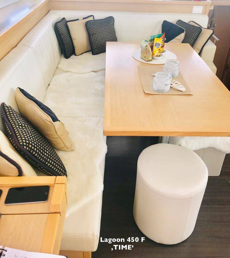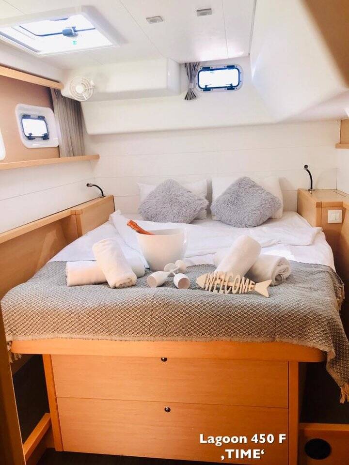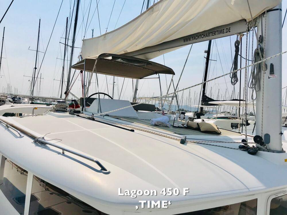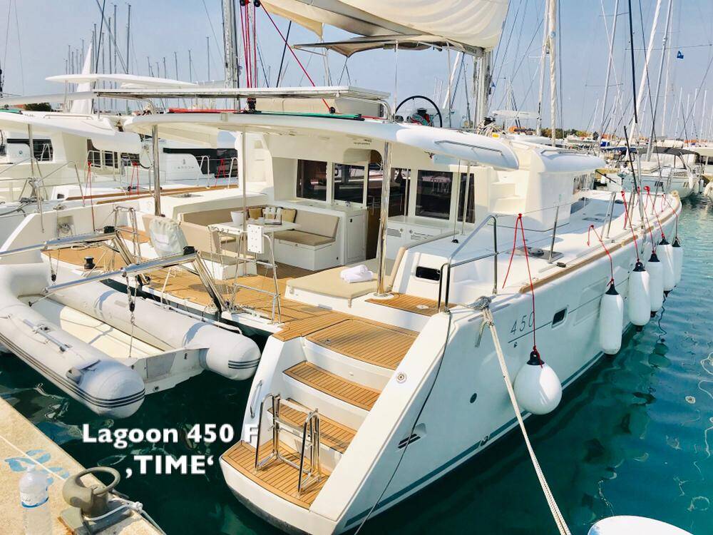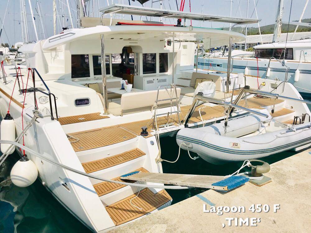 Katamaran Lagoon 450 Time, Baujahr 2015, liegt im Sukosan, D-Marin Dalmacija Marina, Zadar & Umgebung, Kroatien vor Anker. Es verfügt über 4 + 2 Kabinen und bietet Platz für 8 + 2 + 2 Personen mit 4 Toiletten.