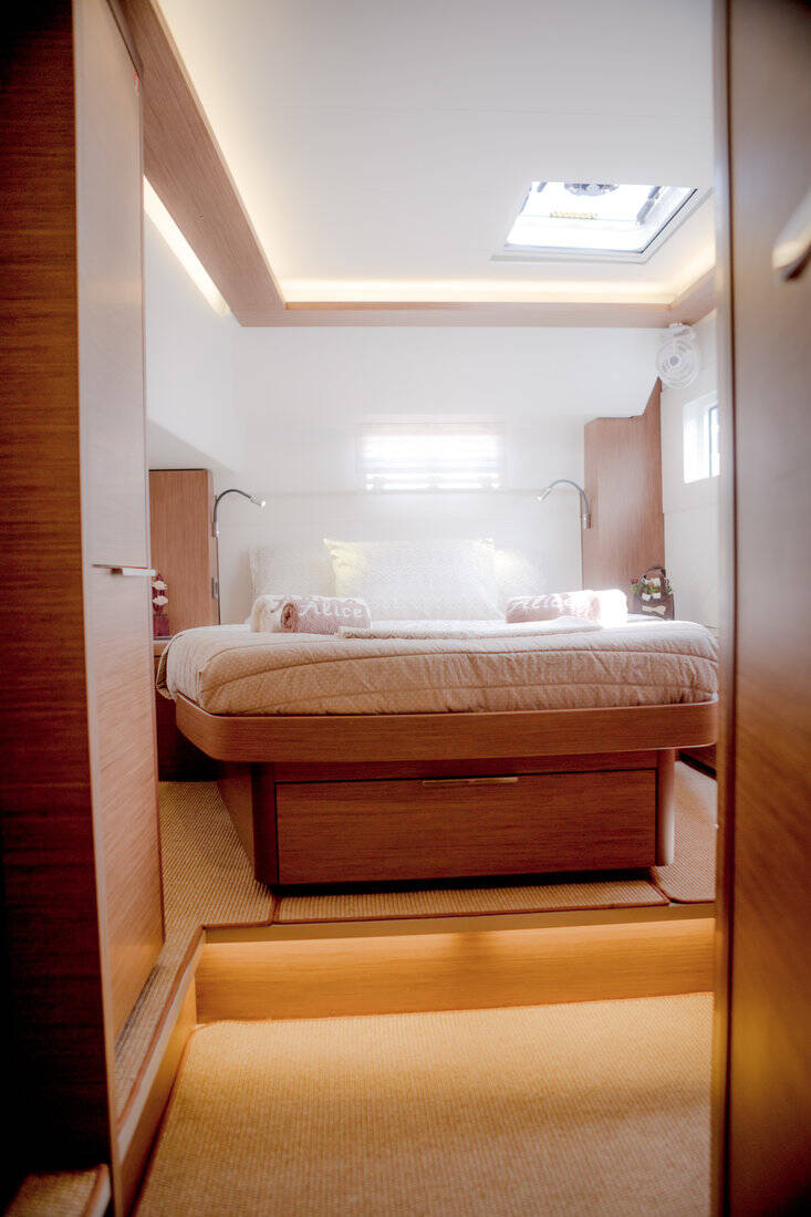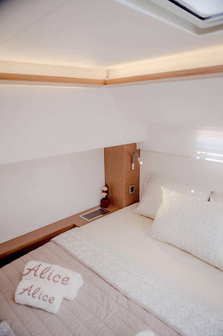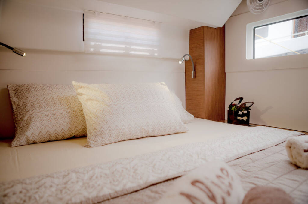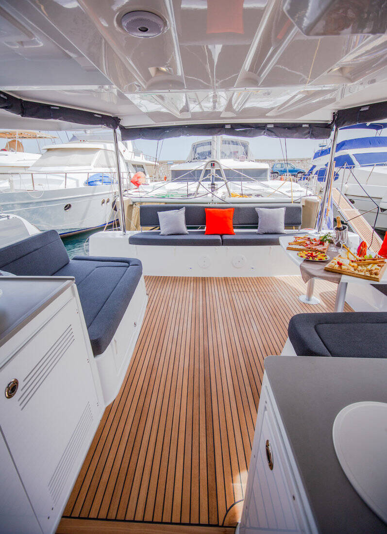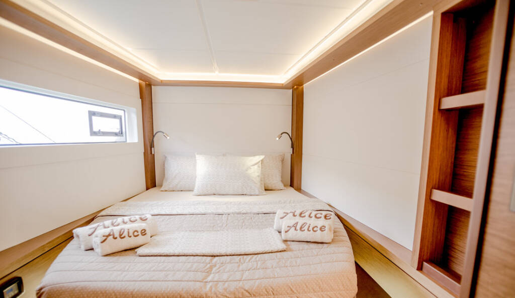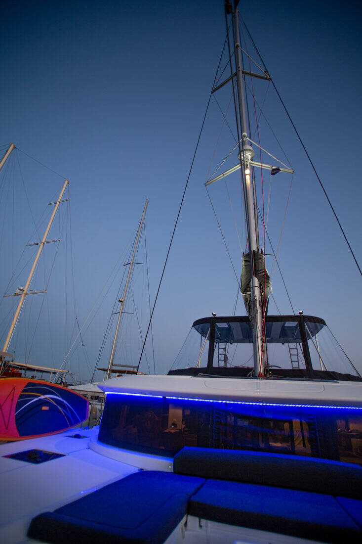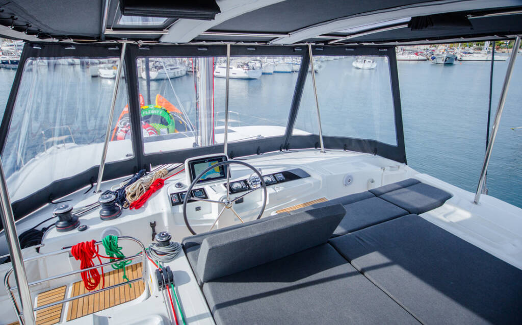 Katamaran Lagoon 46 Alice, Baujahr 2020, liegt im Athens, Alimos marina, Athens area/Saronic/Peloponese, Griechenland vor Anker. Es verfügt über 4 + 2 Kabinen und bietet Platz für 8 + 2 + 2 Personen mit 4 Toiletten.
