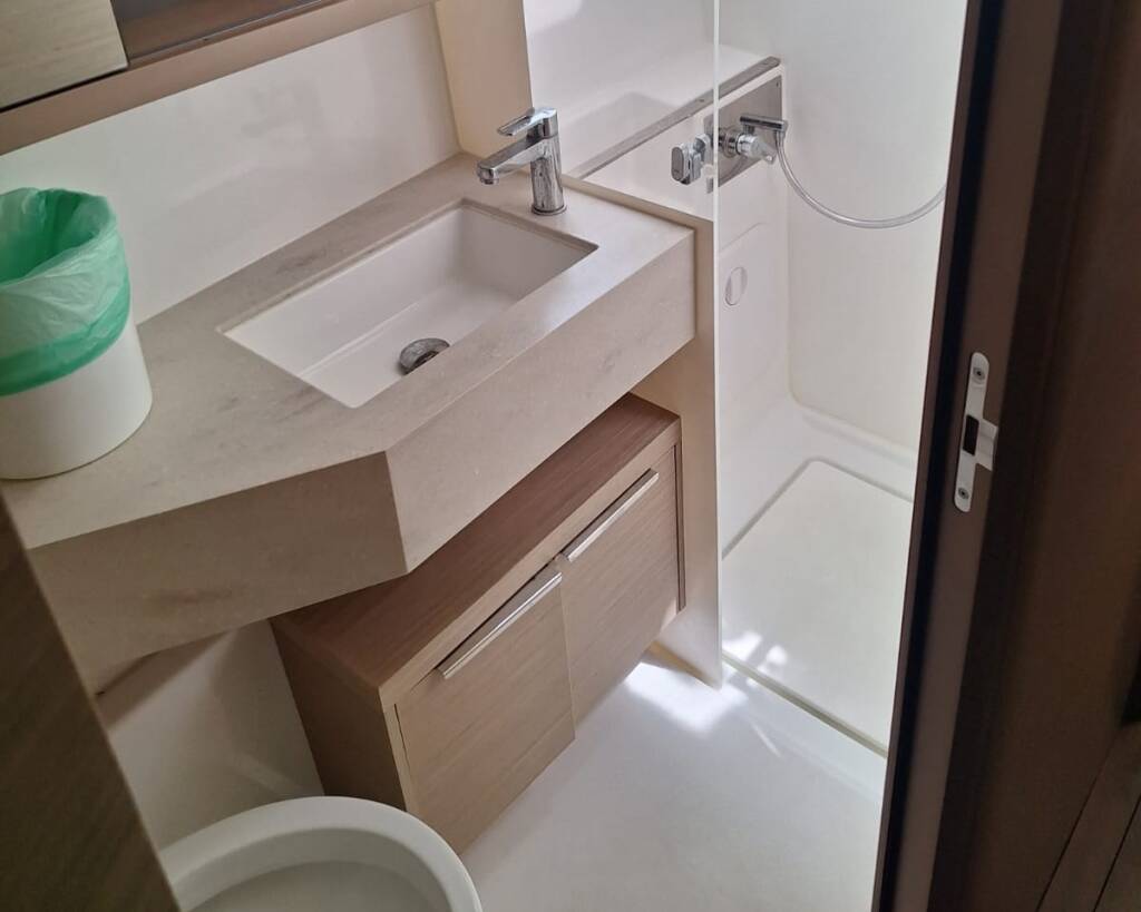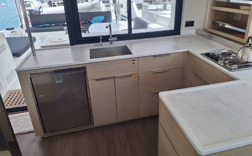 Katamaran Lagoon 46 BOATYLICIOUS, Baujahr 2022, liegt im Grenada, Port Louis Marina, Grenada, Karibik vor Anker. Es verfügt über 4 + 2 Kabinen und bietet Platz für 8 + 2 + 2 Personen mit 4 Toiletten.