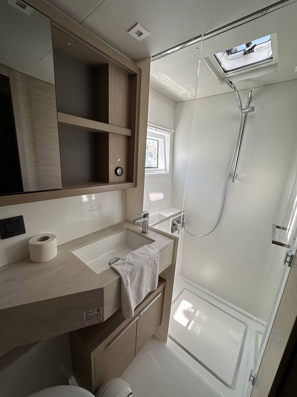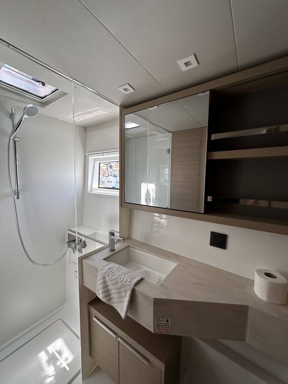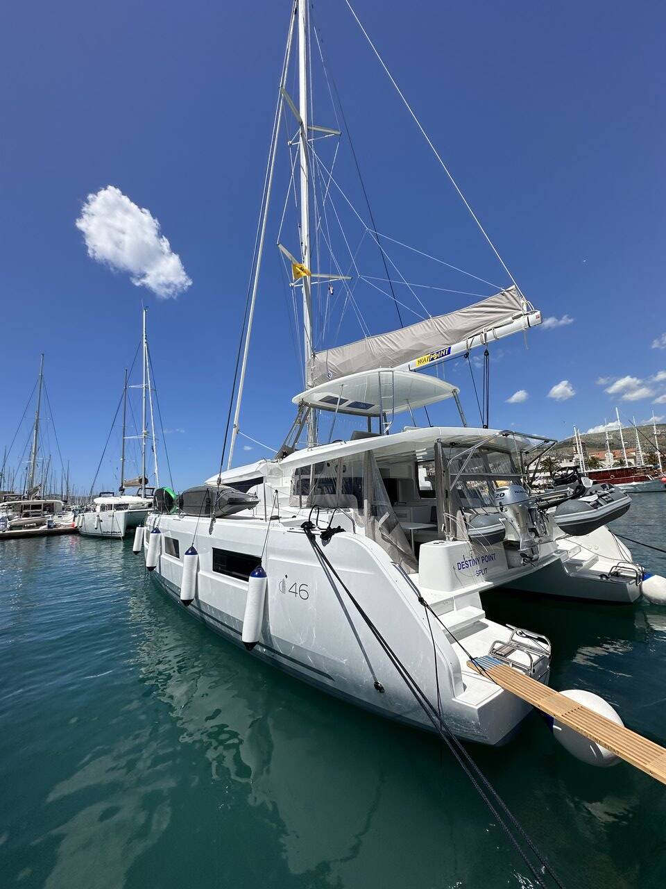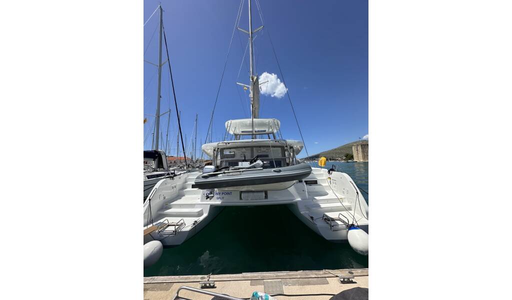 Katamaran Lagoon 46 Destiny Point, Baujahr 2024, liegt im ACI Marina Trogir, Split & Umgebung, Kroatien vor Anker. Es verfügt über 4 + 2 Kabinen und bietet Platz für 8 + 2 + 2 Personen mit 4 Toiletten.