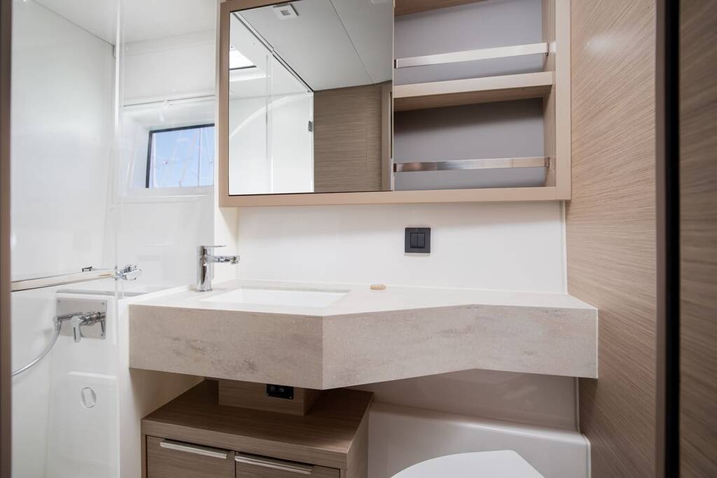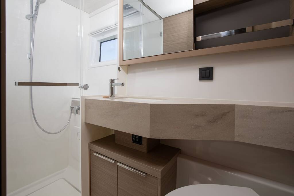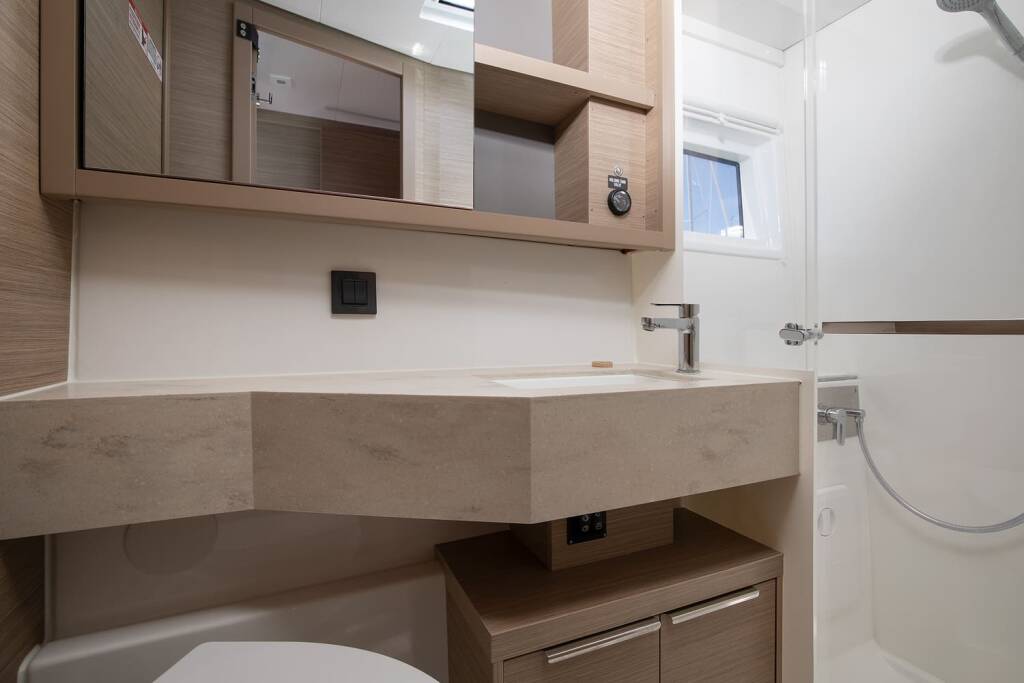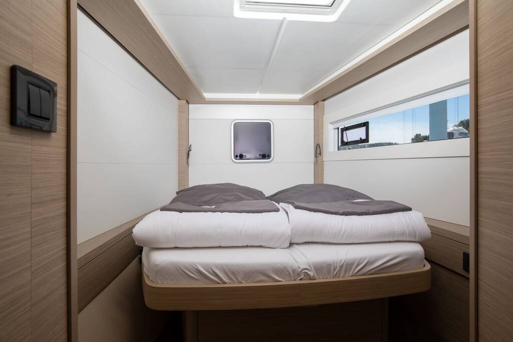 Katamaran Lagoon 46 Manta Maris, Baujahr 2023, liegt im Pula, ACI Marina Pomer, Istrien, Kroatien vor Anker. Es verfügt über 4 + 2 Kabinen und bietet Platz für 8 + 2 + 2 Personen mit 4 Toiletten.