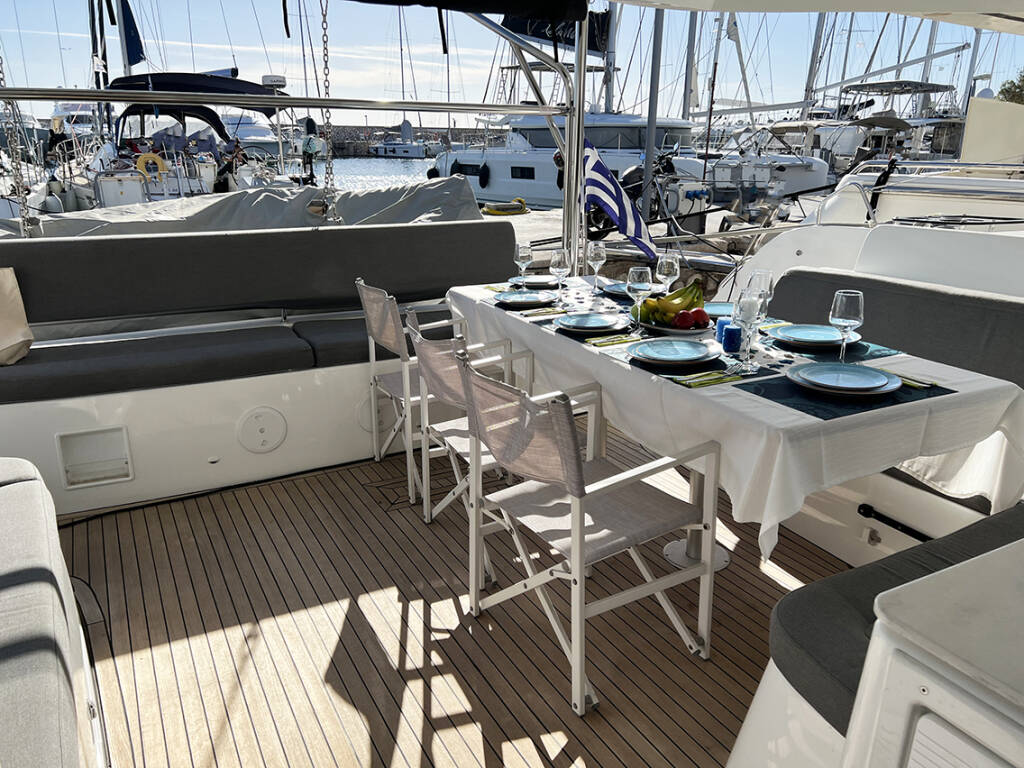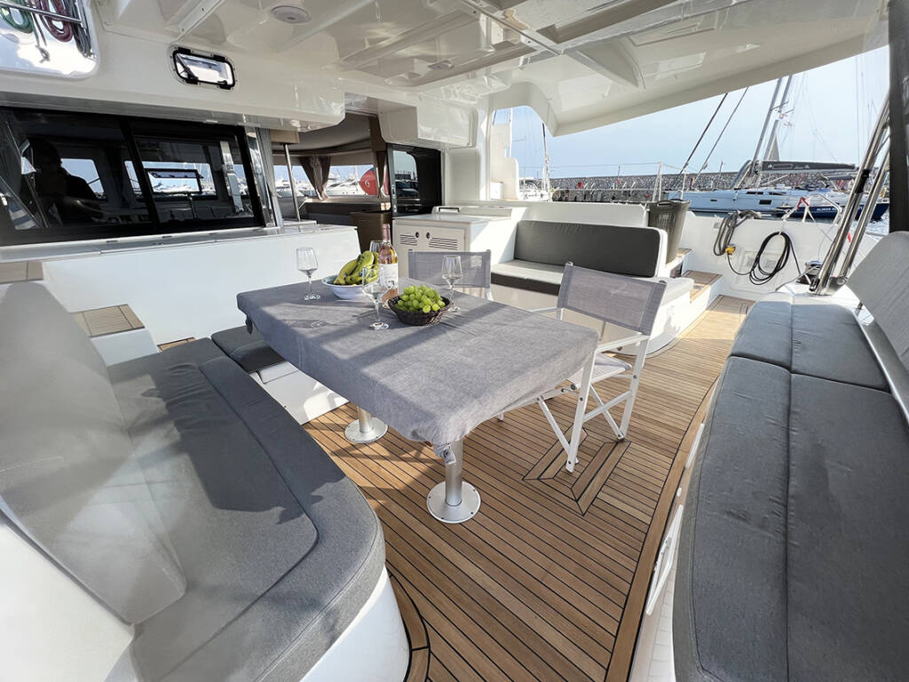 Katamaran Lagoon 46 Moondance, Baujahr 2023, liegt im Athens, Alimos marina, Athens area/Saronic/Peloponese, Griechenland vor Anker. Es verfügt über 4 + 2 Kabinen und bietet Platz für 8 + 2 Personen mit 4 + 2 Toiletten.