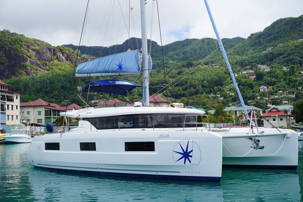 Katamaran Lagoon 46 PRINCESS JULIJA, Baujahr 2023, liegt im Seychelles, Eden Island Marina, Mahé, Seychellen vor Anker. Es verfügt über 4 + 2 Kabinen und bietet Platz für 8 + 2 Personen mit 4 Toiletten.