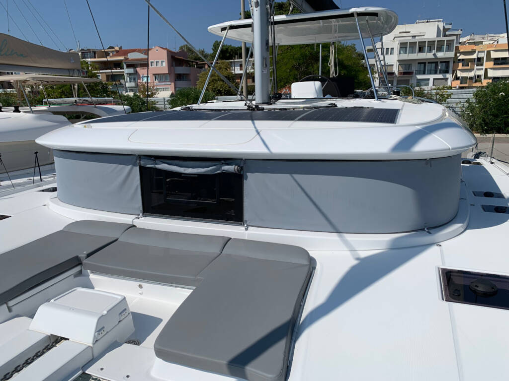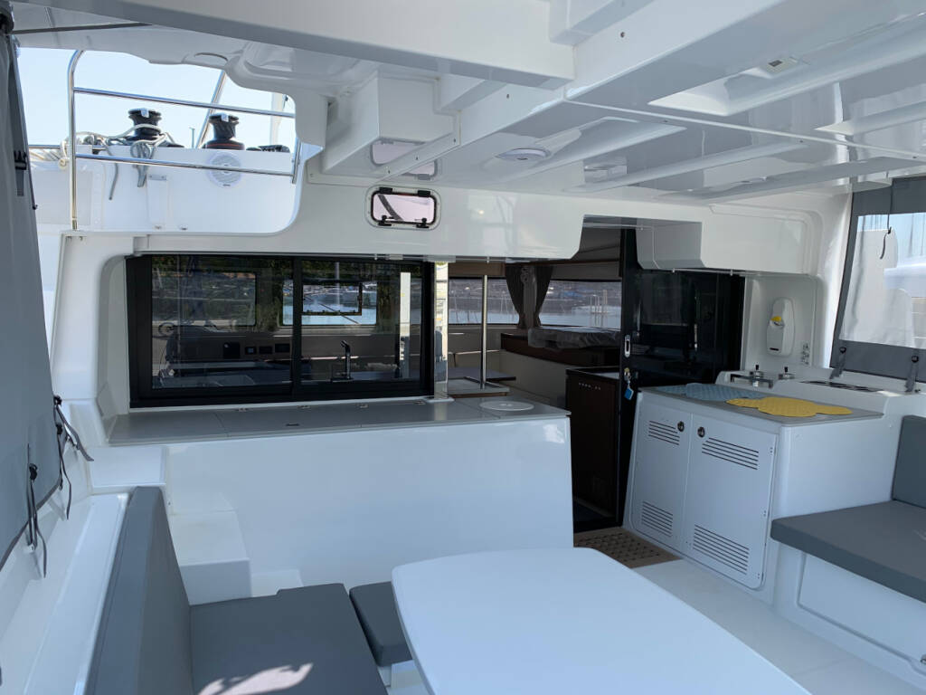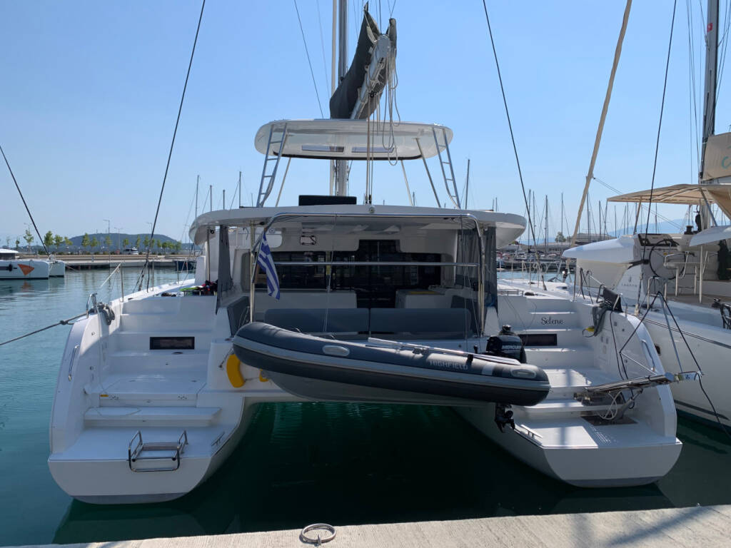Katamaran Lagoon 46 Selene, Baujahr 2020, liegt im Preveza, Cleopatra Marina, Ionisches Meer, Griechenland vor Anker. Es verfügt über 4 + 2 Kabinen und bietet Platz für 8 + 2 + 2 Personen mit 4 Toiletten.
