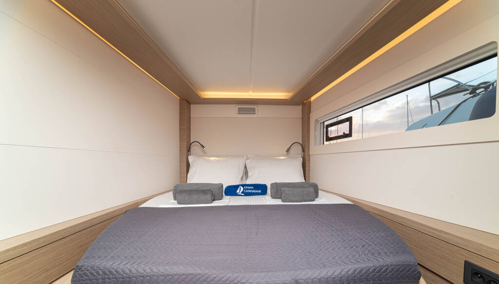 Katamaran Lagoon 46 Spiritus, Baujahr 2023, liegt im Lefkas main port, Ionisches Meer, Griechenland vor Anker. Es verfügt über 4 + 2 Kabinen und bietet Platz für 8 + 2 + 2 Personen mit 4 + 1 Toiletten.