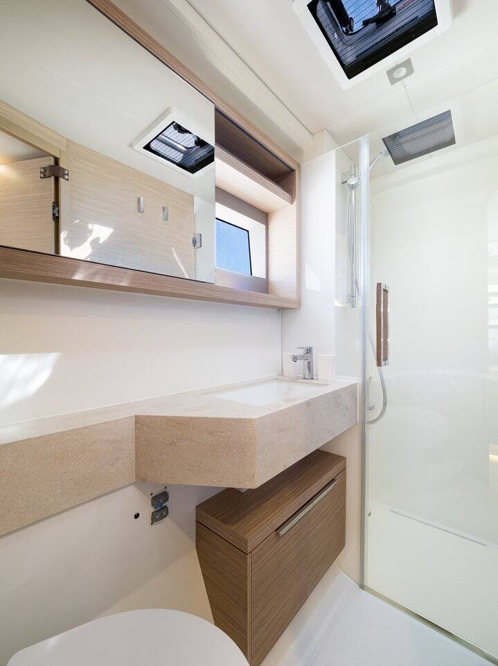 Katamaran Lagoon 51 OW Catwalk, Baujahr 2024, liegt im Marina Kastela, Split & Umgebung, Kroatien vor Anker. Es verfügt über 5 Kabinen und bietet Platz für 6 Personen mit 3 + 1 Toiletten.