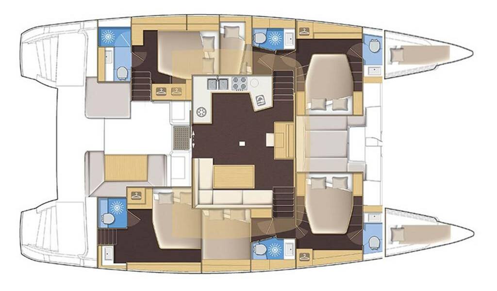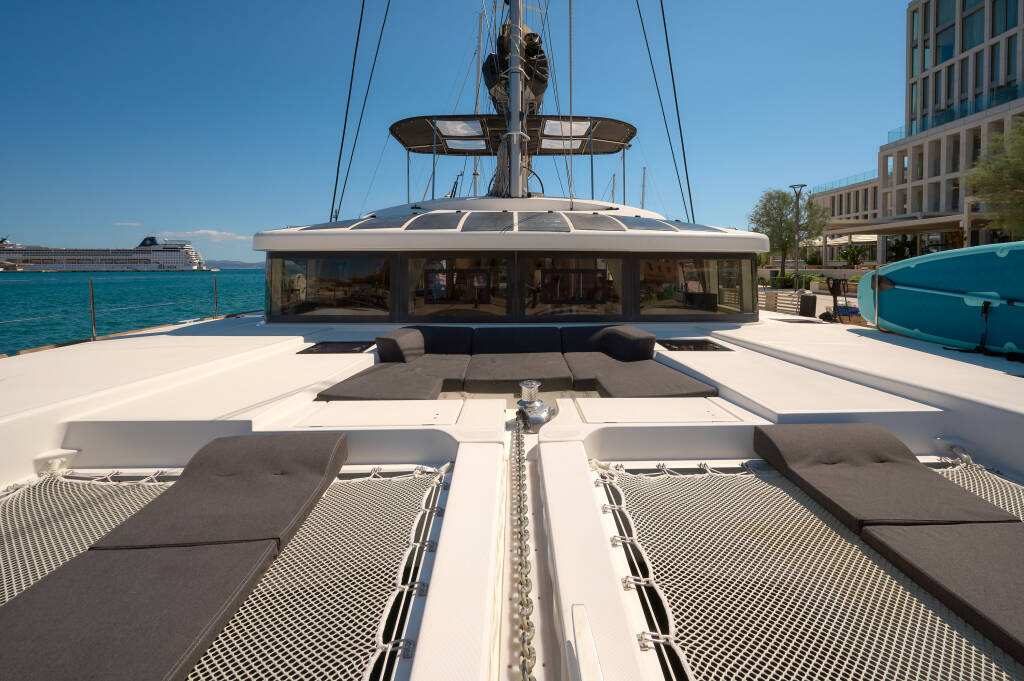 Katamaran Lagoon 52 F Akana, Baujahr 2019, liegt im Trogir, Marina Trogir (ex.SCT), Split & Umgebung, Kroatien vor Anker. Es verfügt über 5 + 2 Kabinen und bietet Platz für 10 + 2 Personen mit 6 Toiletten.