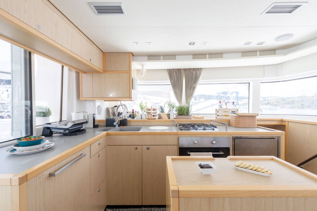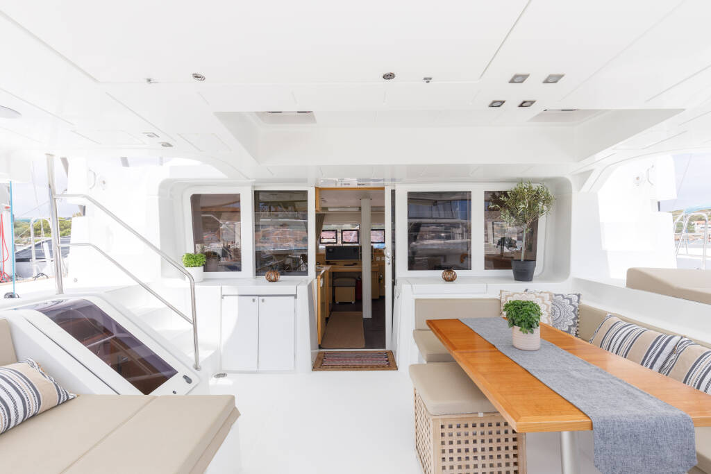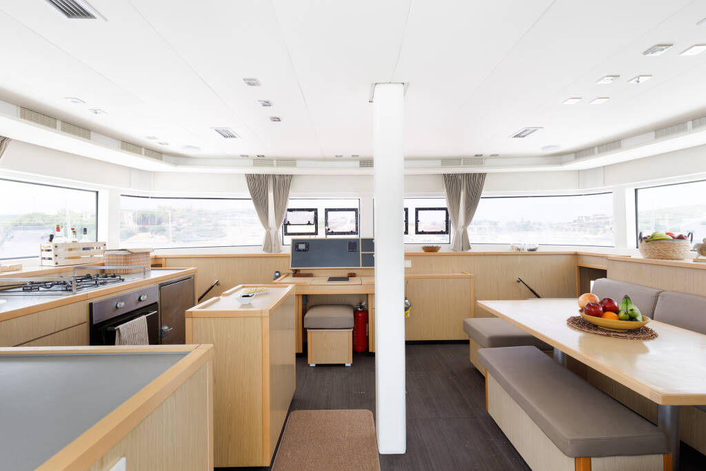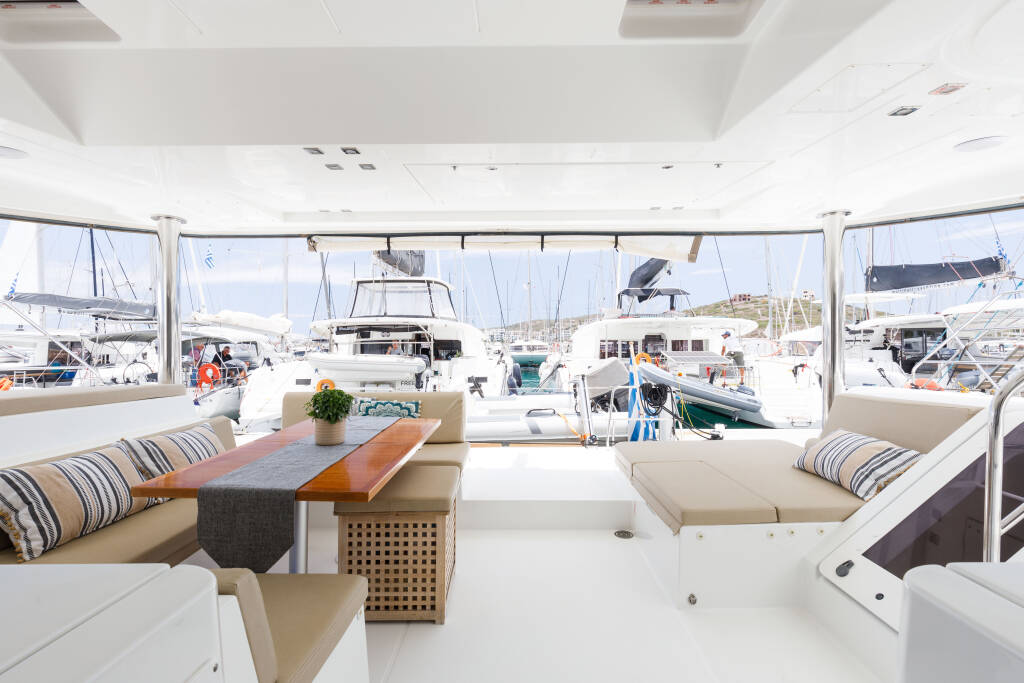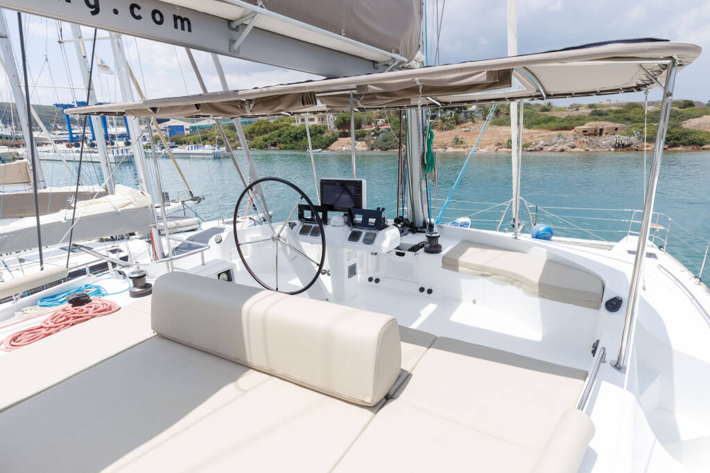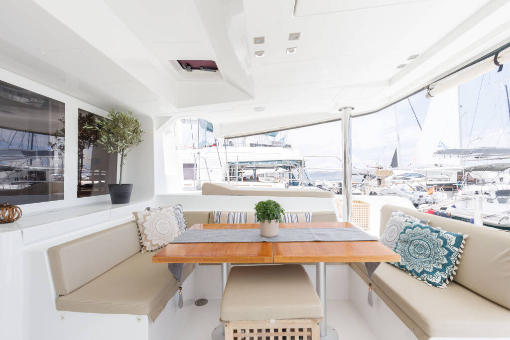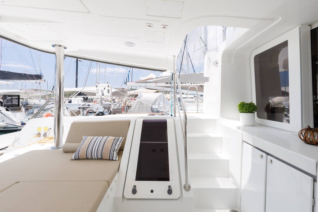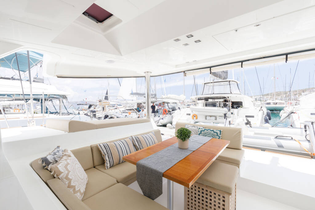 Katamaran Lagoon 52 Kepi, Baujahr 2014, liegt im Lavrion - Olympic Marine, Athens area/Saronic/Peloponese, Griechenland vor Anker. Es verfügt über 5 + 2 Kabinen und bietet Platz für 10 + 2 Personen mit 5 + 1 Toiletten.