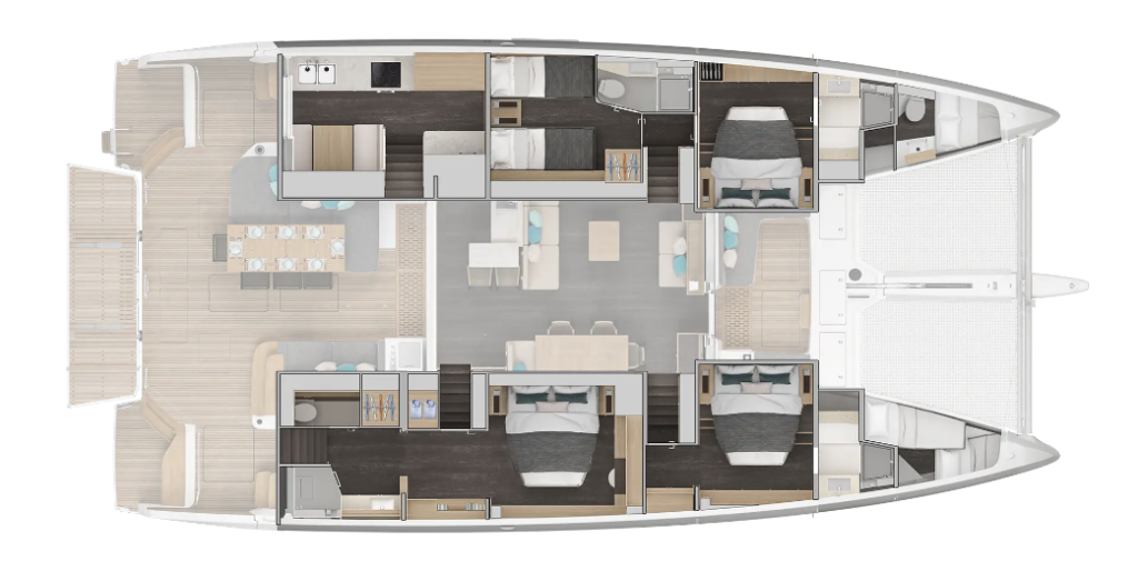 Katamaran Lagoon 60 Sofia, Baujahr 2026, liegt im Marina di Portisco, Sardinien, Italien vor Anker. Es verfügt über 4 + 2 Kabinen und bietet Platz für 8 + 4 Personen mit 4 + 2 Toiletten.