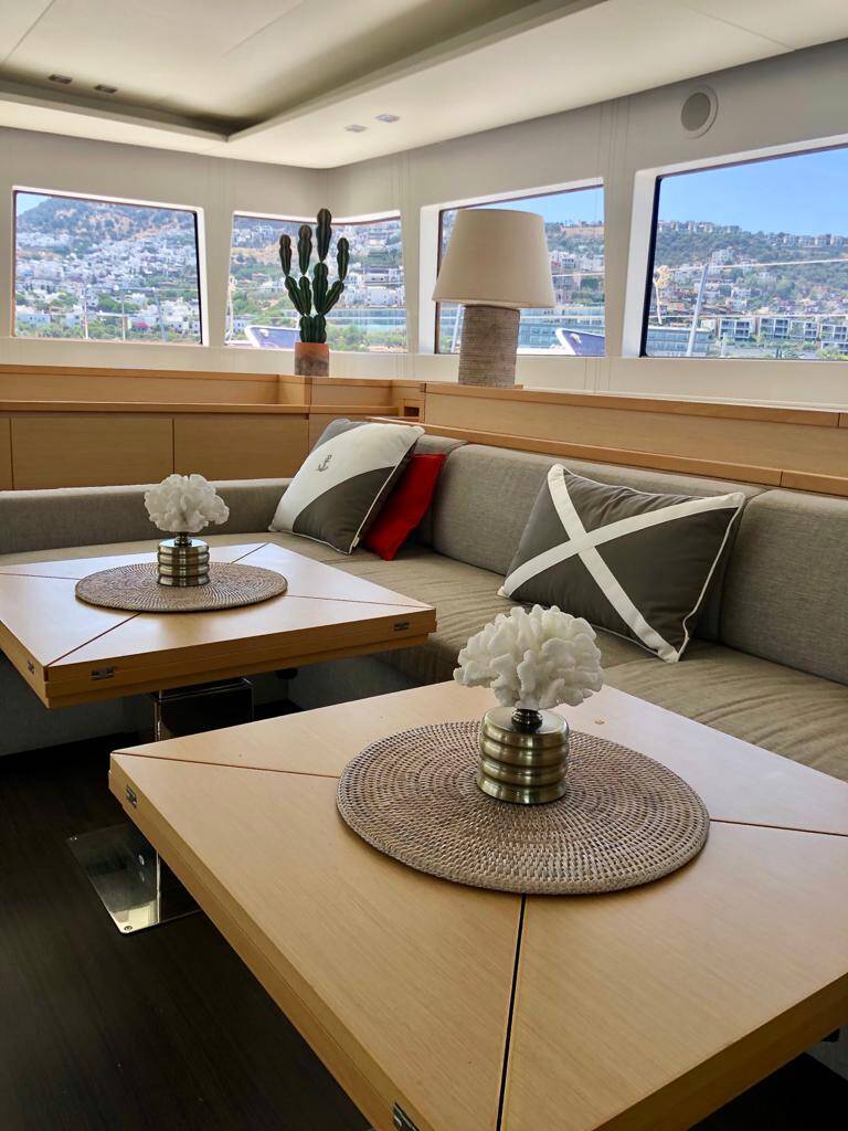 Katamaran Lagoon 620 Camaron, Baujahr 2014, liegt im Bodrum, Milta Marina, Aegean, Türkei vor Anker. Es verfügt über 4 + 2 Kabinen und bietet Platz für 8 + 2 Personen mit 4 Toiletten.