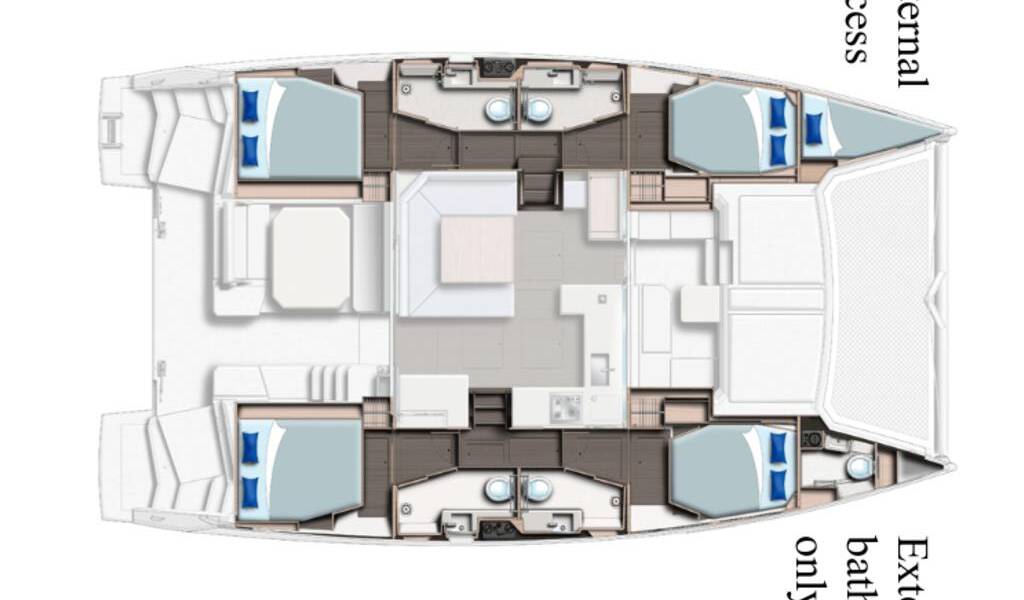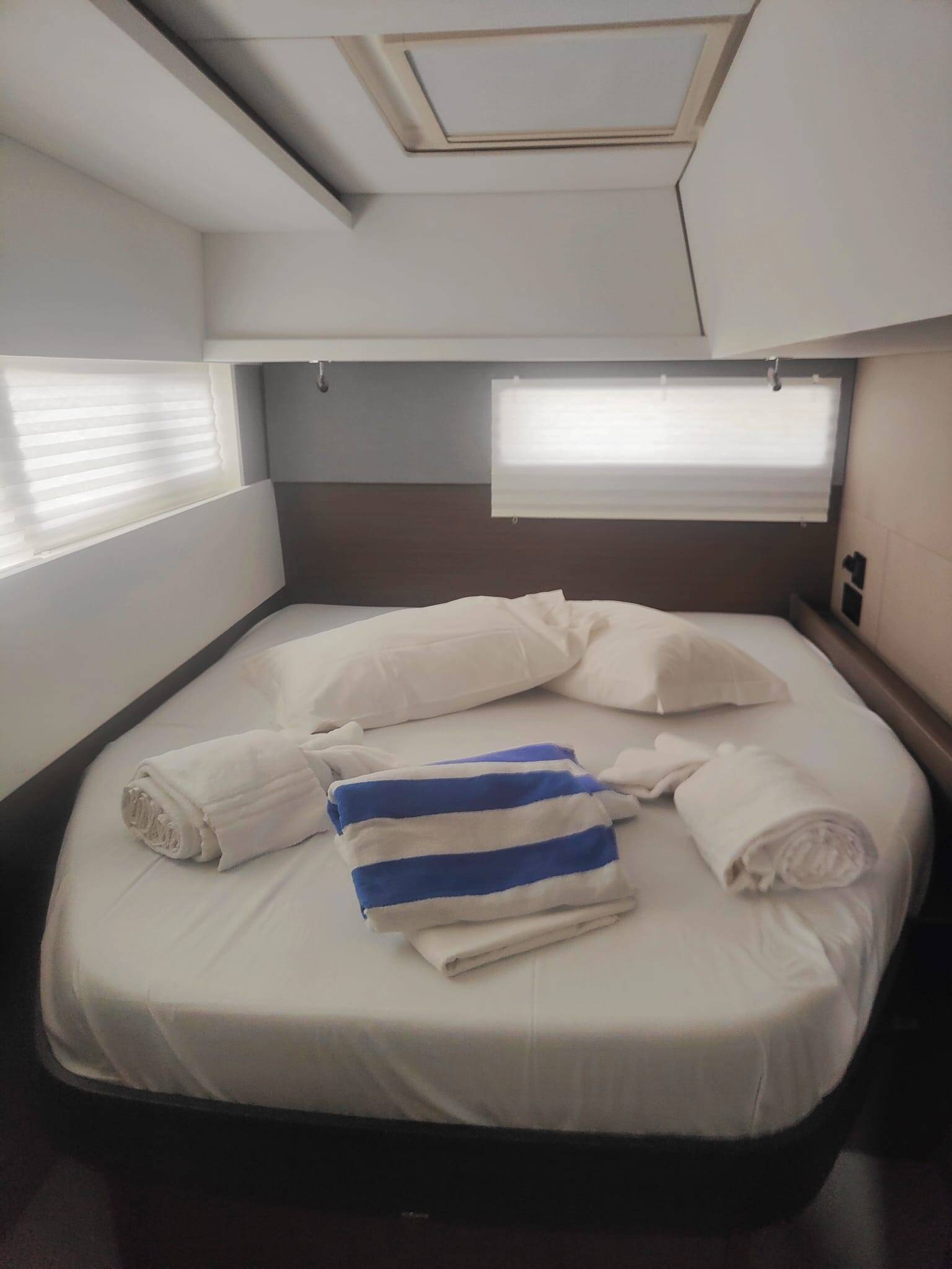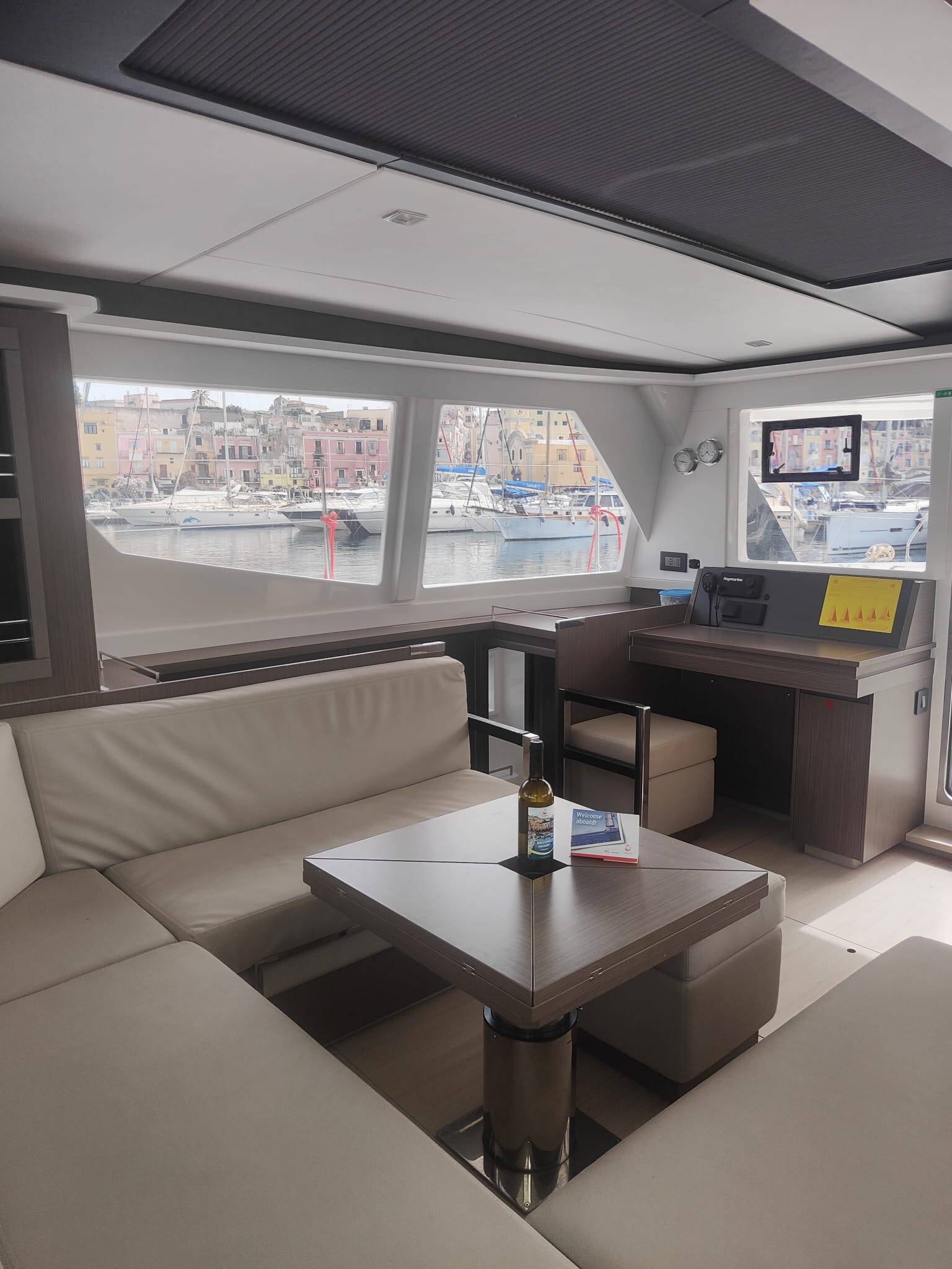 Katamaran Leopard 45 Daria, Baujahr 2023, liegt im Procida, Campania, Italien vor Anker. Es verfügt über 4 + 1 Kabinen und bietet Platz für 8 + 2 + 1 Personen mit 4 + 1 Toiletten.