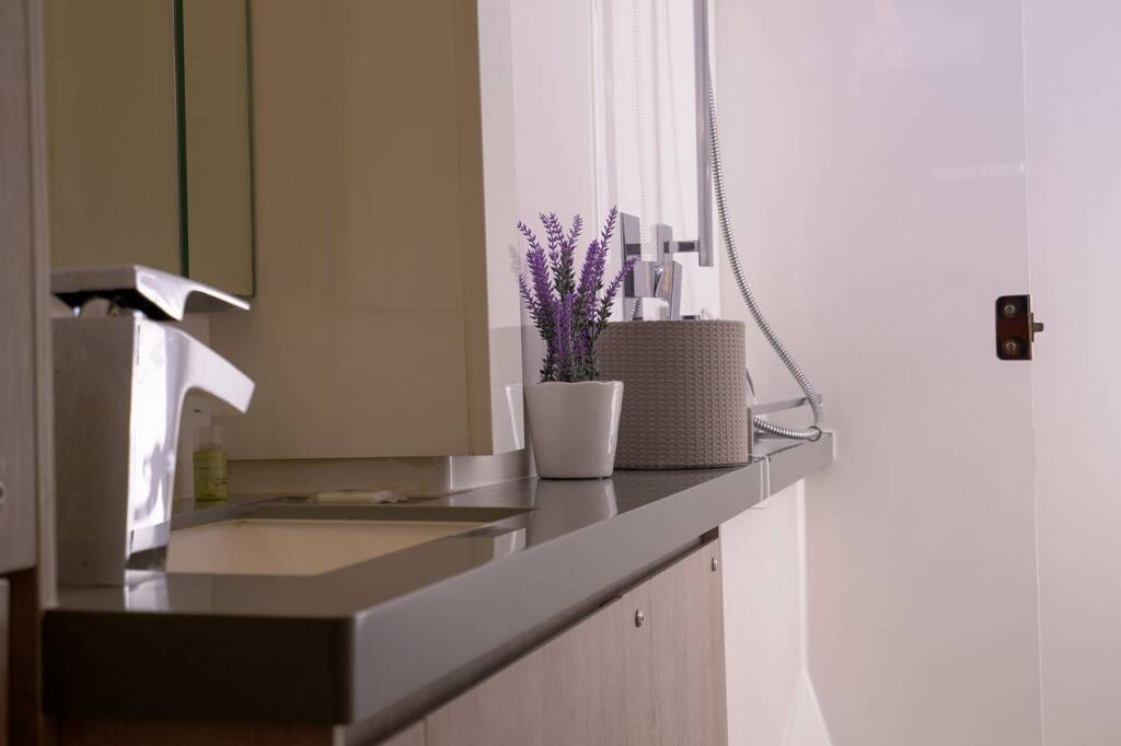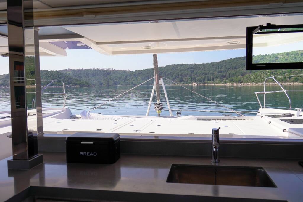 Katamaran Leopard 45 Manaphy, Baujahr 2020, liegt im Trogir, Yachtclub Seget (Marina Baotić), Split & Umgebung, Kroatien vor Anker. Es verfügt über 3 + 1 Kabinen und bietet Platz für 6 + 2 + 1 Personen mit 3 Toiletten.
