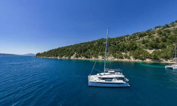 Katamaran Leopard 50L Lady Amanda, Baujahr 2020, liegt im Split, West Coast (Zapadna obala), Split & Umgebung, Kroatien vor Anker. Es verfügt über 5 + 1 Kabinen und bietet Platz für 10 + 1 Personen mit 5 Toiletten.