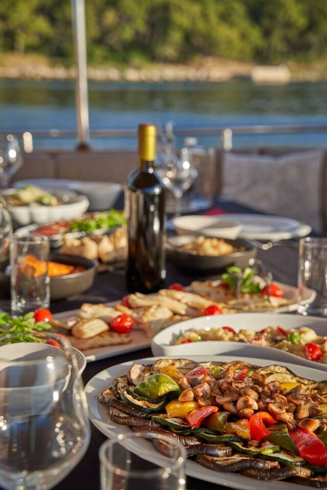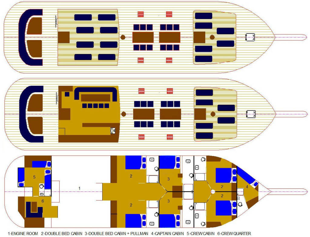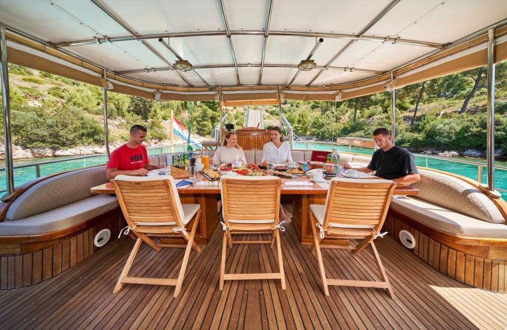 5. Dem äußeren Layout wurde besondere Aufmerksamkeit geschenkt. Es gibt einen geräumigen Loungebereich auf dem Deck, einen erhöhten Sonnenbereich mit Sonnenpolstern und Matratzen, Treppen, die von beiden Seiten ins Meer führen, und einen schönen Essbereich auf dem Achterdeck, der bei Bedarf leicht beschattet werden kann.