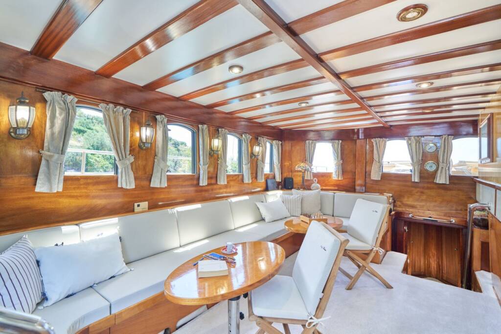 2. Das Interieur ist aus glänzendem Holz mit leicht getönten Paneelen und weißem Dekor. Schaffung eines frischen, nautischen Ambiente.