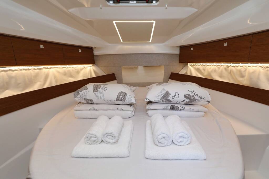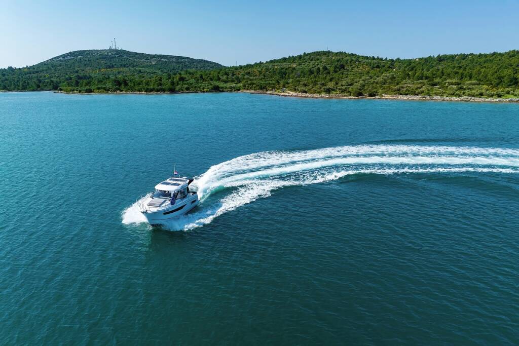 Motorboot Merry Fisher 895 Permer, Baujahr 2023, liegt im Marina Pirovac, Sibenik & Umgebung, Kroatien vor Anker. Es verfügt über 2 Kabinen und bietet Platz für 4 + 2 Personen mit 1 Toiletten.