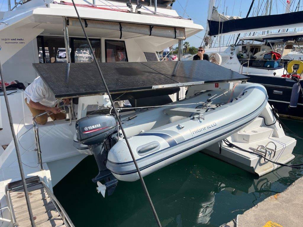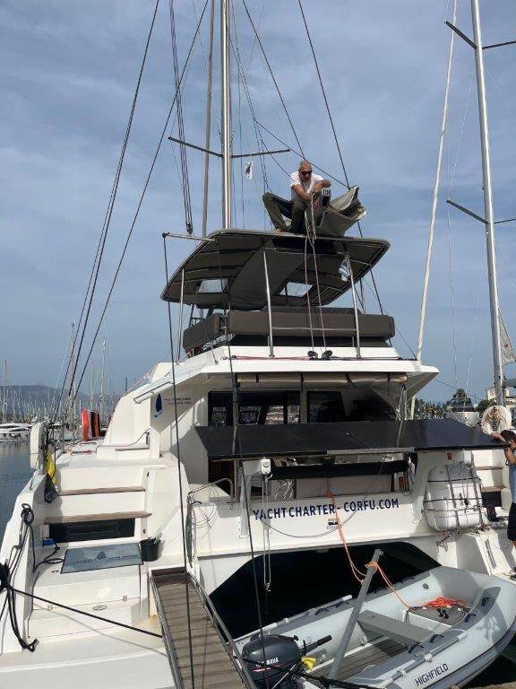Katamaran Nautitech 46 Mira, Baujahr 2018, liegt im Corfu, Gouvia Marina, Ionisches Meer, Griechenland vor Anker. Es verfügt über 4 + 2 Kabinen und bietet Platz für 8 + 2 + 2 Personen mit 4 Toiletten.