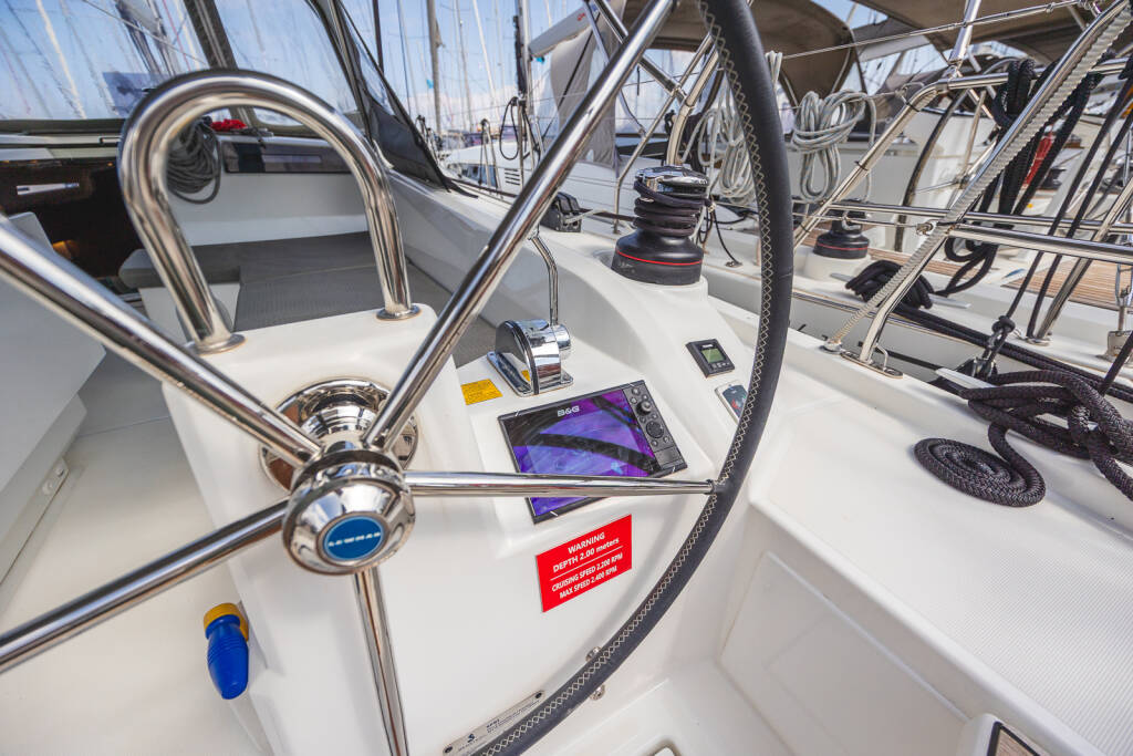 Segelyacht Oceanis 40.1 Elma, Baujahr 2022, liegt im Lefkas, D-Marin, Ionisches Meer, Griechenland vor Anker. Es verfügt über 3 Kabinen und bietet Platz für 6 + 2 Personen mit 2 Toiletten.