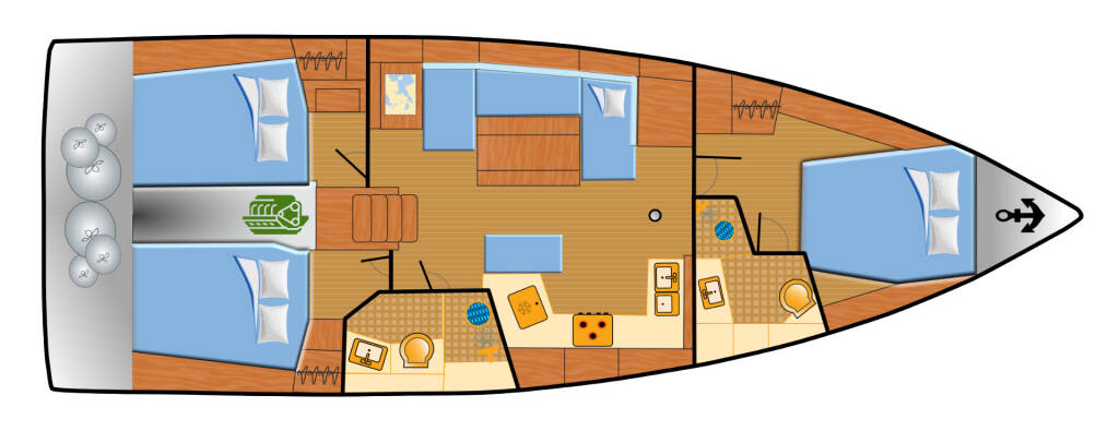 Lautsprecher im Innenraum und Wasserdichte Außenlautsprecher, USB Steckdosen im Salon und in allen Kabinen,