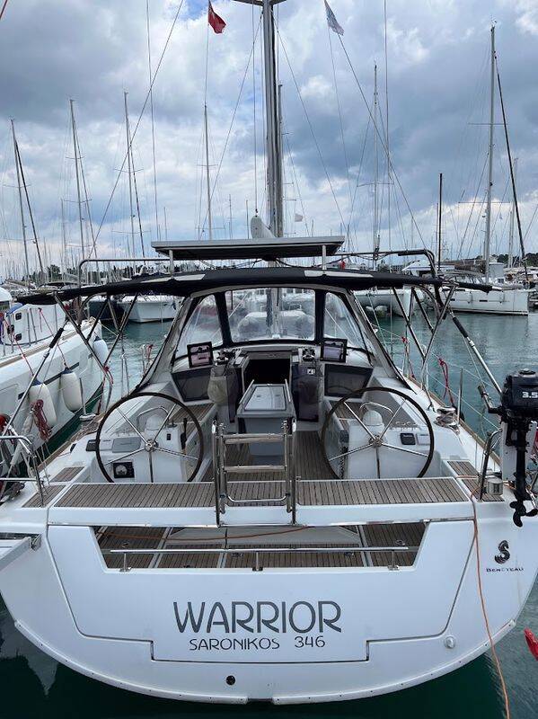 Segelyacht Oceanis 41 Warrior, Baujahr 2013, liegt im Corfu, Gouvia Marina, Ionisches Meer, Griechenland vor Anker. Es verfügt über 3 Kabinen und bietet Platz für 6 Personen mit 2 Toiletten.