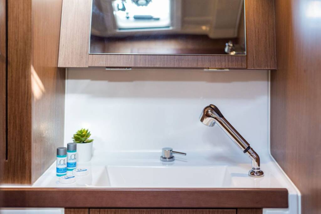 Segelyacht Oceanis 41.1 Elena, Baujahr 2020, liegt im Lefkas, D-Marin, Ionisches Meer, Griechenland vor Anker. Es verfügt über 3 Kabinen und bietet Platz für 6 Personen mit 2 Toiletten.
