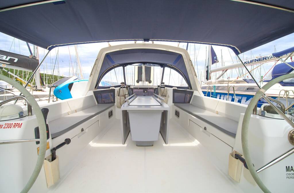 Segelyacht Oceanis 45 Ponente, Baujahr 2013, liegt im Marina Punat, Krk, Kvarner, Kroatien vor Anker. Es verfügt über 4 Kabinen und bietet Platz für 8 + 2 Personen mit 2 Toiletten.