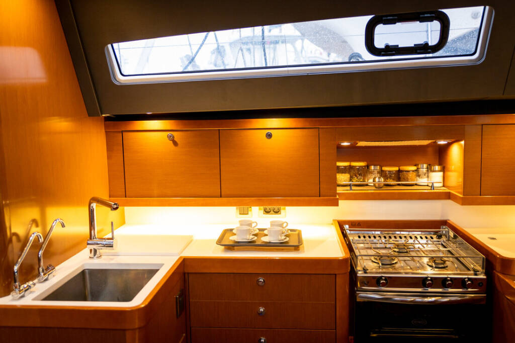 Segelyacht Oceanis 60 Ultreya, Baujahr 2017, liegt im Lefkas main port, Ionisches Meer, Griechenland vor Anker. Es verfügt über 3 + 1 Kabinen und bietet Platz für 6 + 2 + 2 Personen mit 4 Toiletten.