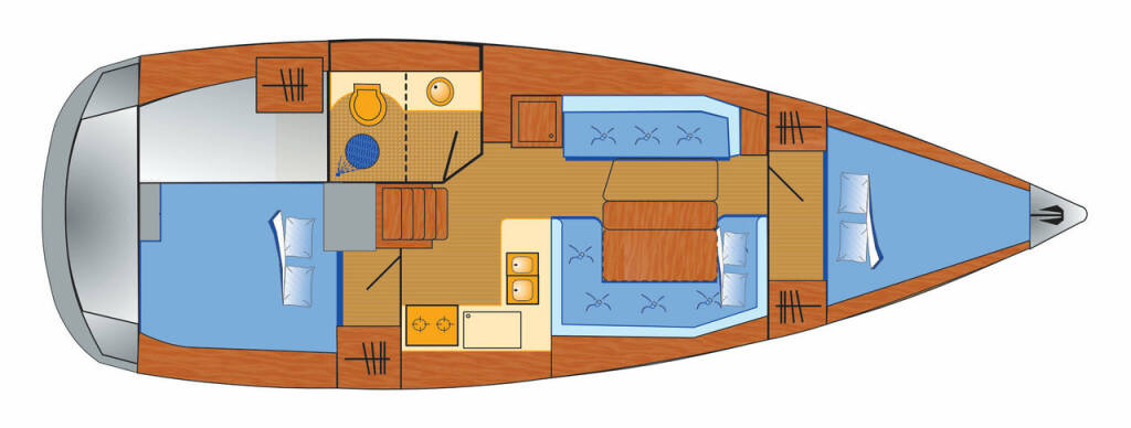 Solarpaneele auf Deck, Ventilatoren im Salon, CD Radio mit 2 Lautsprechern im Salon und Cockpit