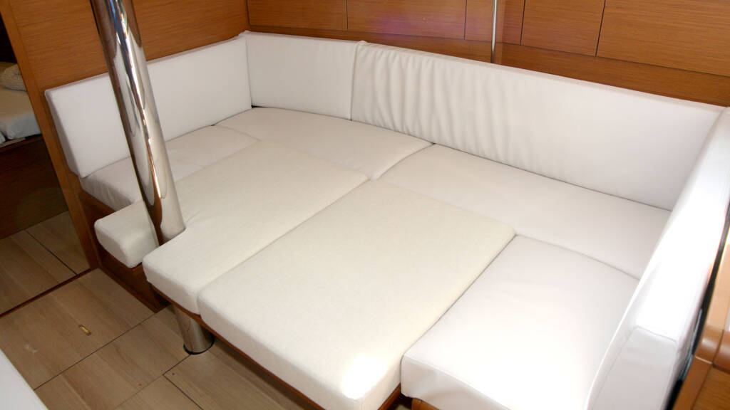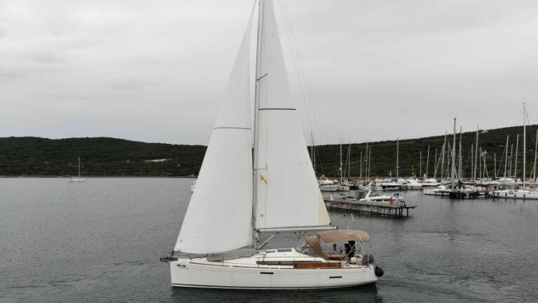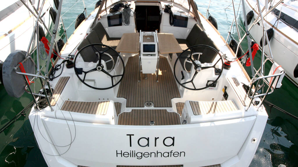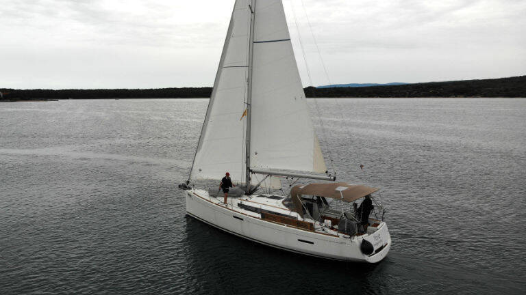 Segelyacht Sun Odyssey 389 Tara, Baujahr 2019, liegt im Marina Punat, Krk, Kvarner, Kroatien vor Anker. Es verfügt über 2 Kabinen und bietet Platz für 4 + 1 Personen mit 1 Toiletten.