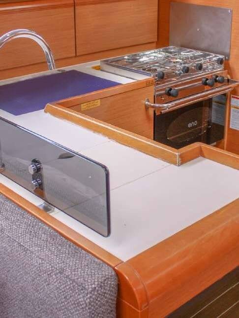 Segelyacht Sun Odyssey 409 Sora, Baujahr 2012, liegt im Denia, Marina de Dénia, Alicante, Spanien vor Anker. Es verfügt über 3 Kabinen und bietet Platz für 6 + 2 Personen mit 2 Toiletten.