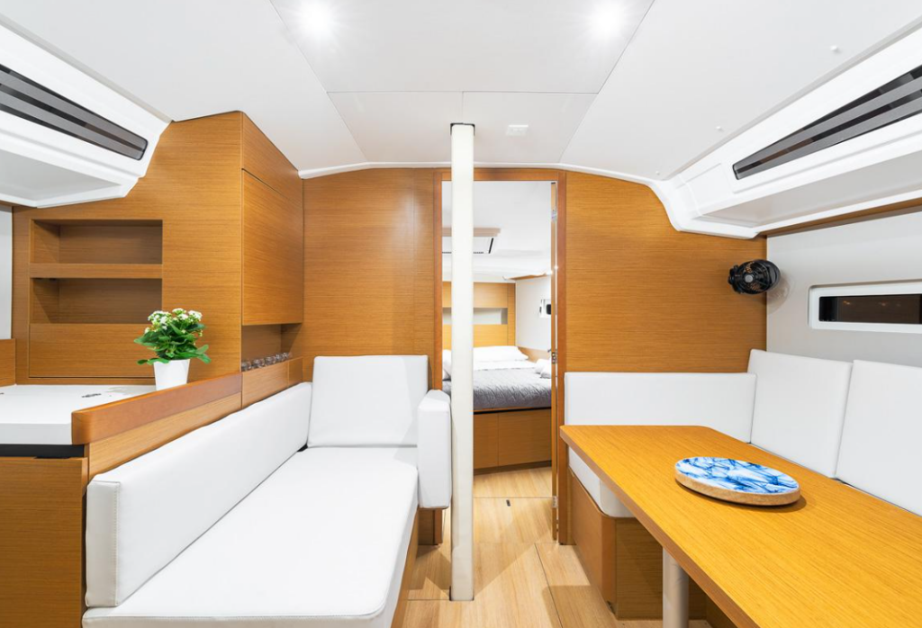 Segelyacht Sun Odyssey 410 Chimera, Baujahr 2021, liegt im Lefkas, D-Marin, Ionisches Meer, Griechenland vor Anker. Es verfügt über 3 Kabinen und bietet Platz für 6 + 2 Personen mit 2 Toiletten.