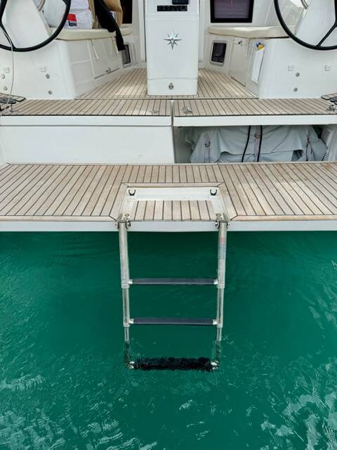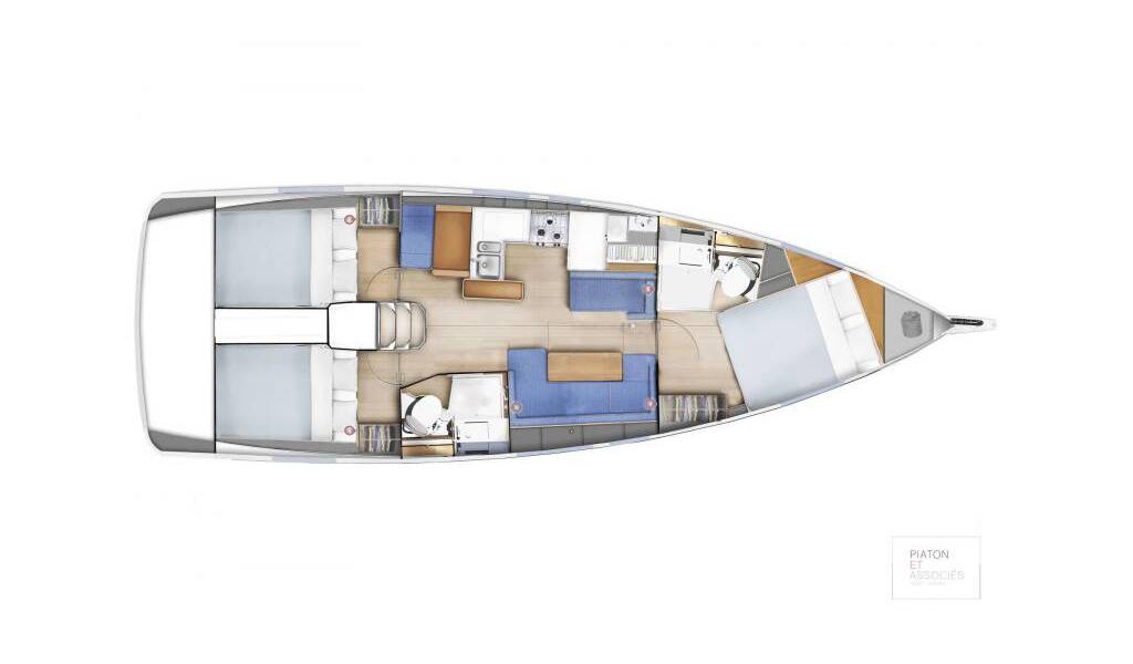 Segelyacht Sun Odyssey 410 Lucia, Baujahr 2023, liegt im Pylos, Pylos Marina, Ionisches Meer, Griechenland vor Anker. Es verfügt über 3 Kabinen und bietet Platz für 6 + 2 Personen mit 2 Toiletten.