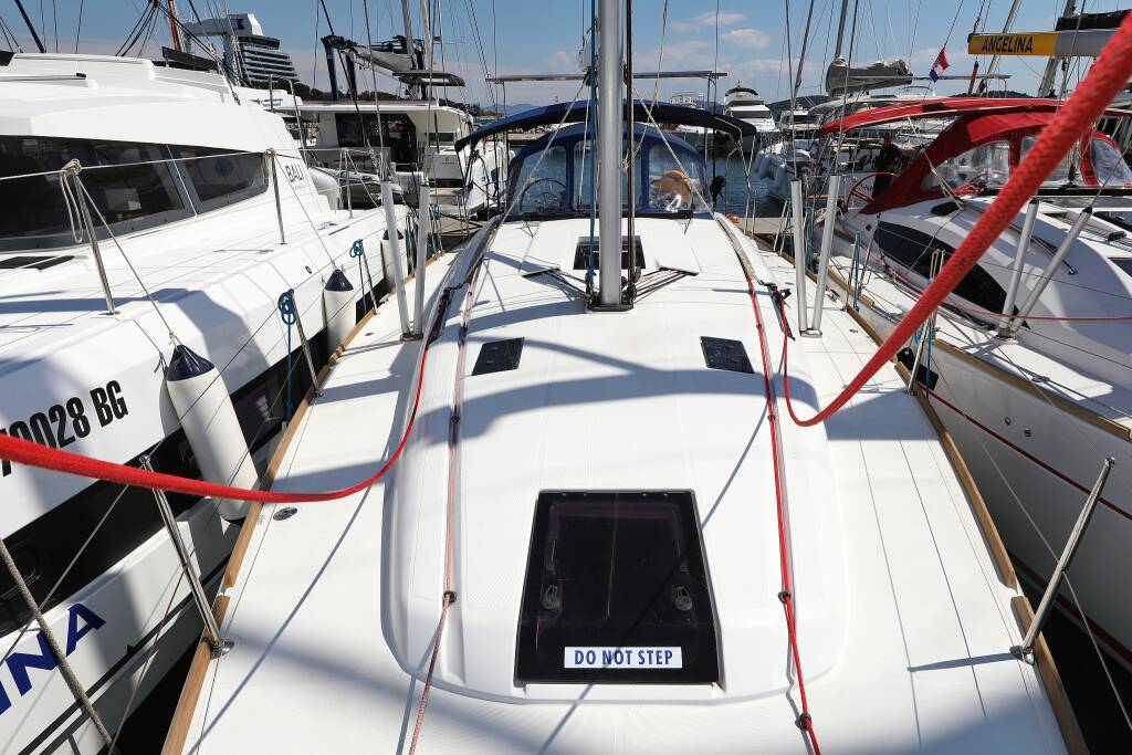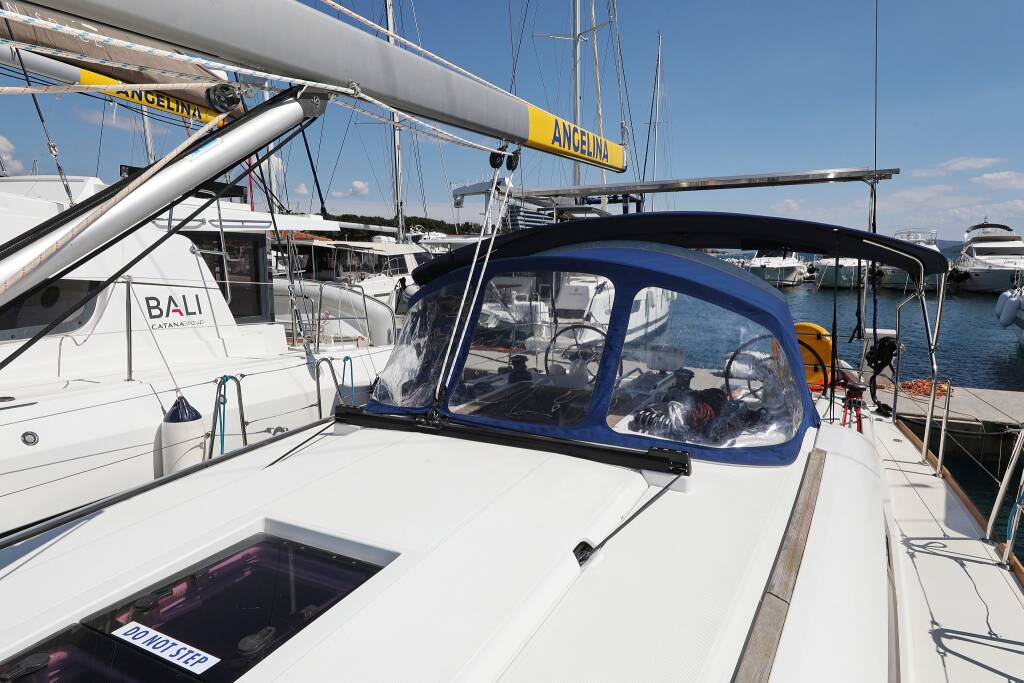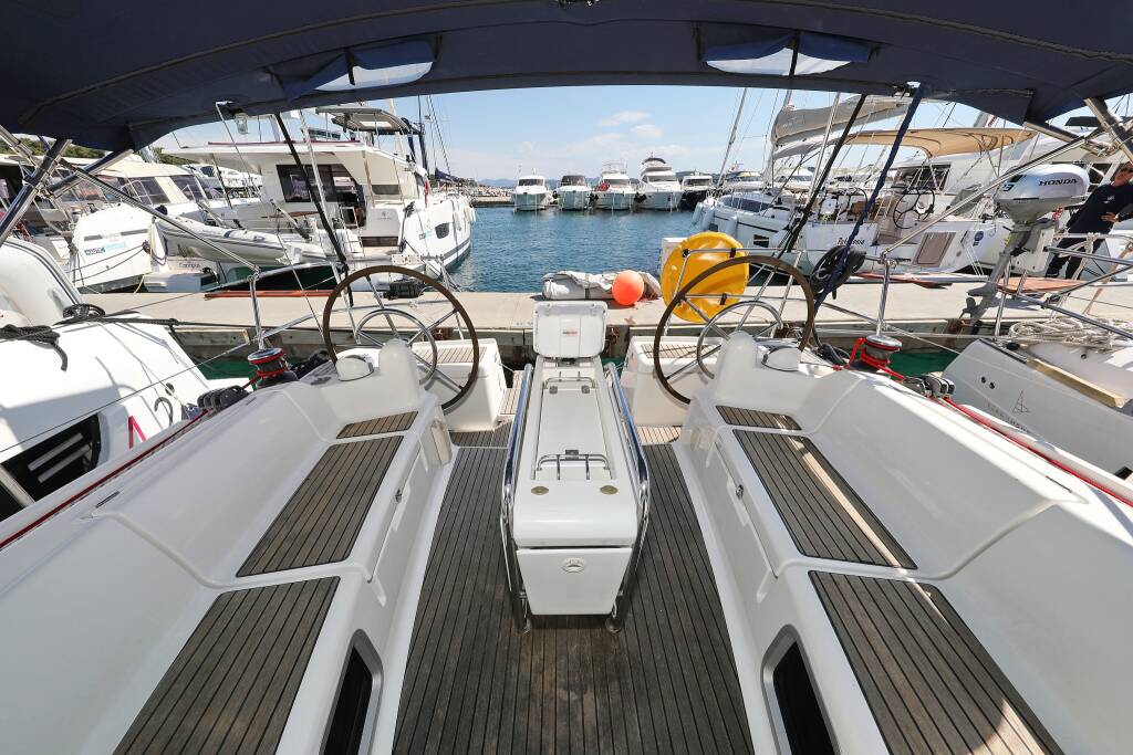Segelyacht Sun Odyssey 439 Malin, Baujahr 2013, liegt im ACI Marina Vodice, Sibenik & Umgebung, Kroatien vor Anker. Es verfügt über 4 Kabinen und bietet Platz für 8 + 2 Personen mit 2 Toiletten.