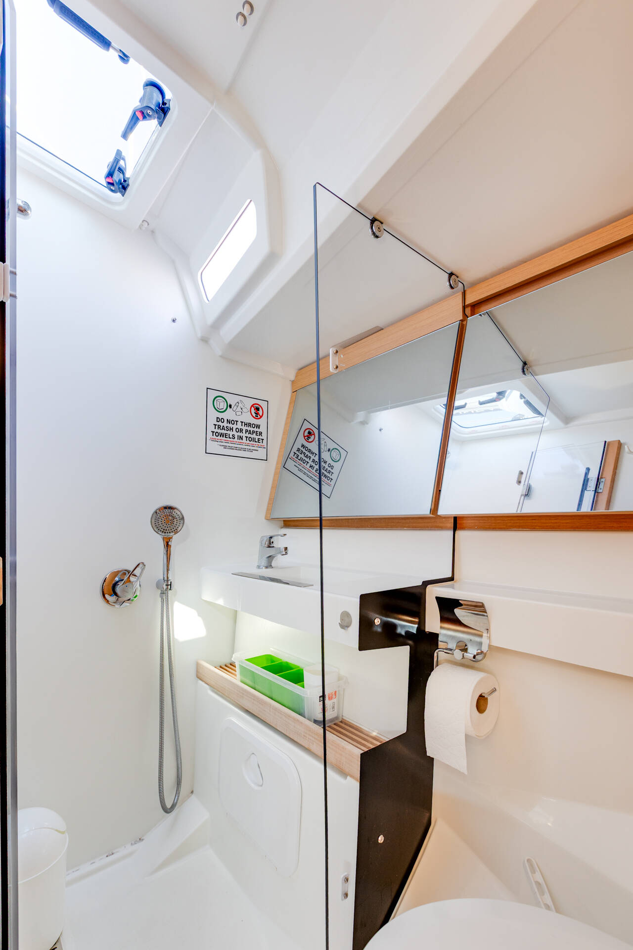 Segelyacht Sun Odyssey 440 Ikarus, Baujahr 2018, liegt im Marina Punat, Krk, Kvarner, Kroatien vor Anker. Es verfügt über 3 Kabinen und bietet Platz für 6 + 2 Personen mit 2 Toiletten.