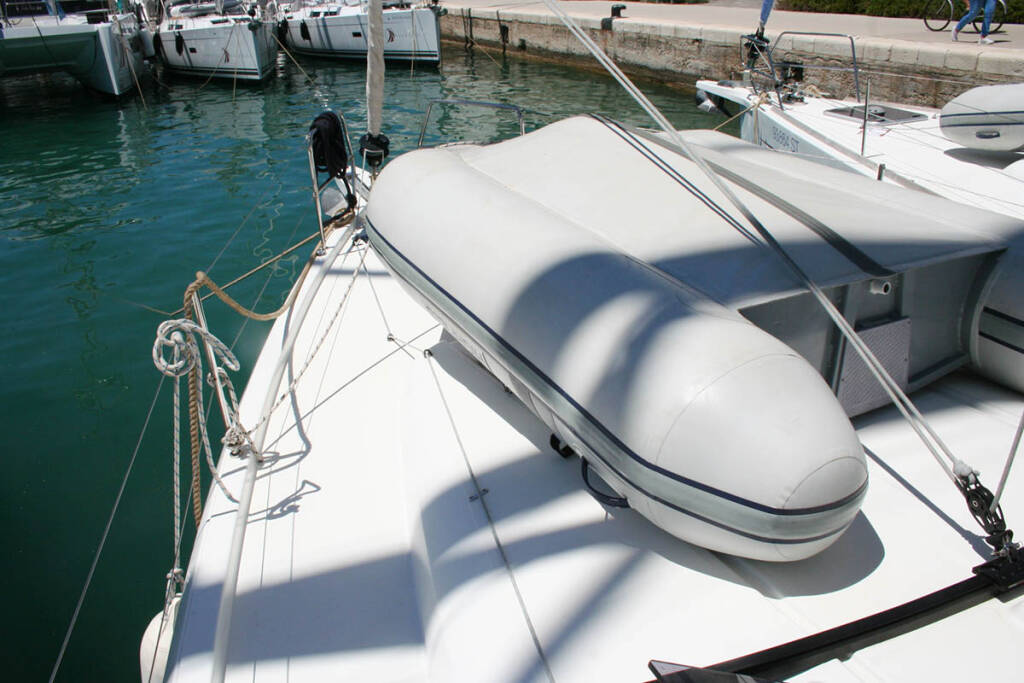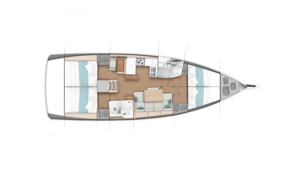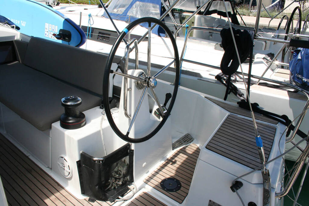 Segelyacht Sun Odyssey 440 Springbank, Baujahr 2019, liegt im Trogir, Yachtclub Seget (Marina Baotić), Split & Umgebung, Kroatien vor Anker. Es verfügt über 4 Kabinen und bietet Platz für 8 + 2 Personen mit 2 Toiletten.