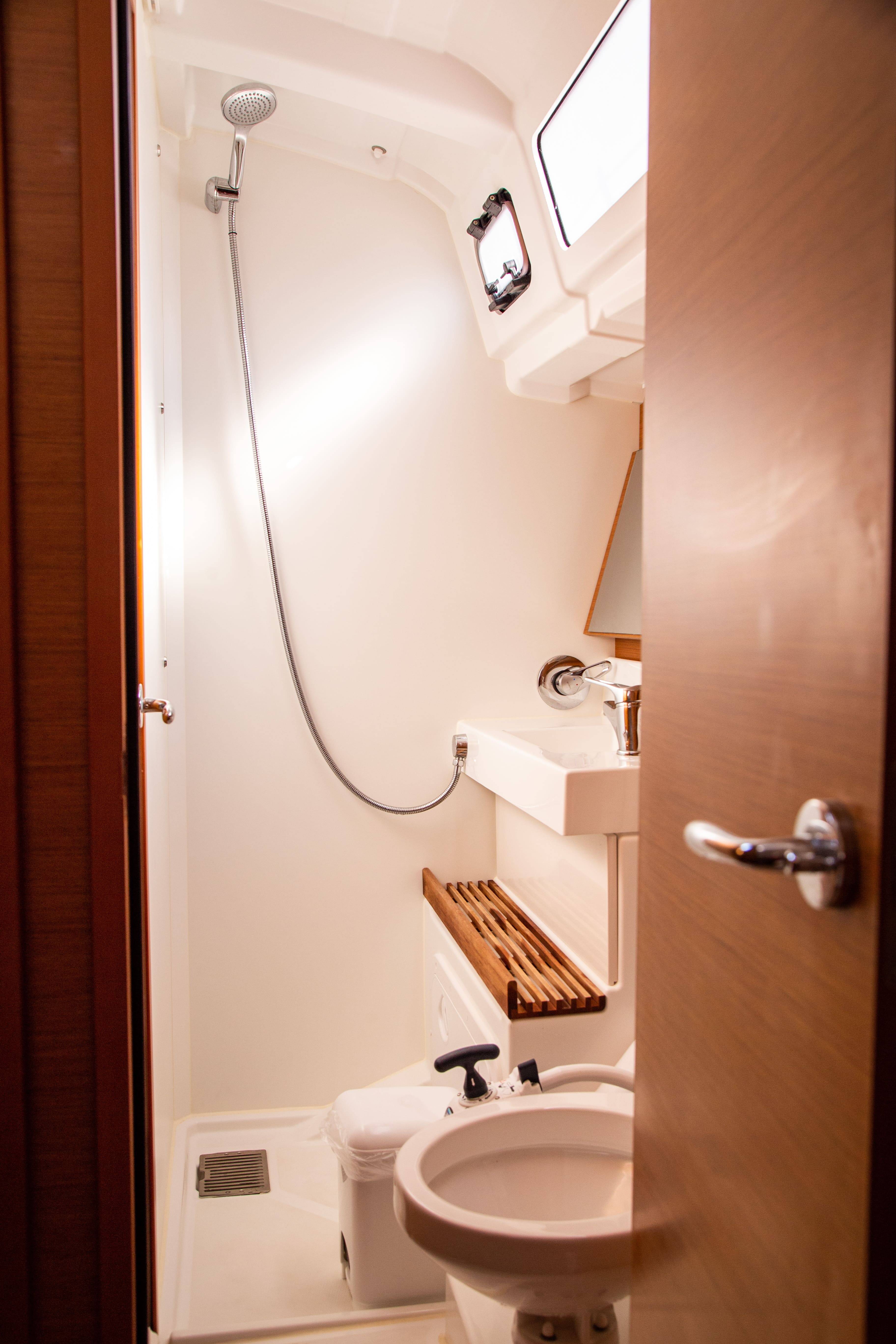 Segelyacht Sun Odyssey 490 Thaleia, Baujahr 2020, liegt im Corfu, Benitses Port Yacht Marina, Ionisches Meer, Griechenland vor Anker. Es verfügt über 5 Kabinen und bietet Platz für 10 + 2 Personen mit 3 Toiletten.