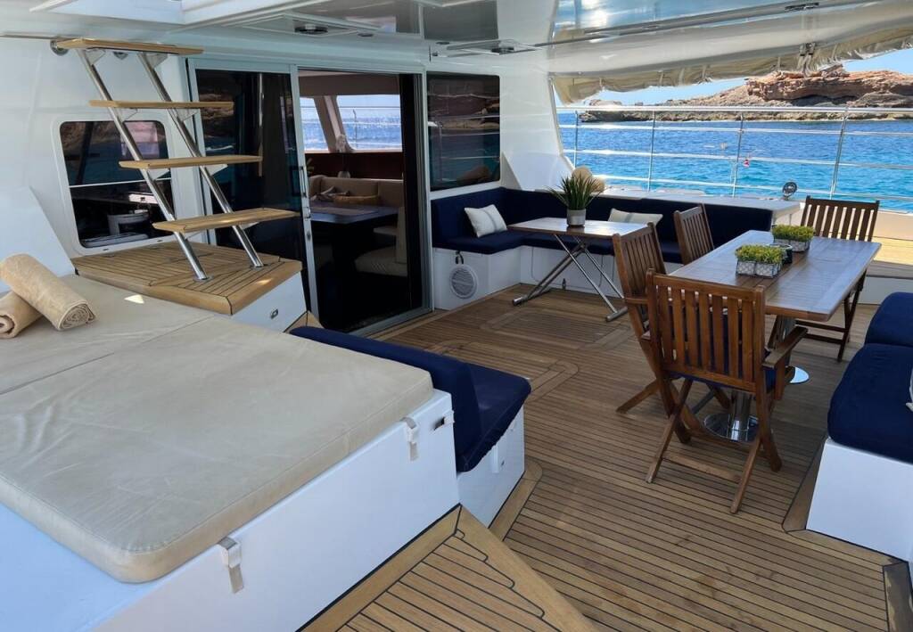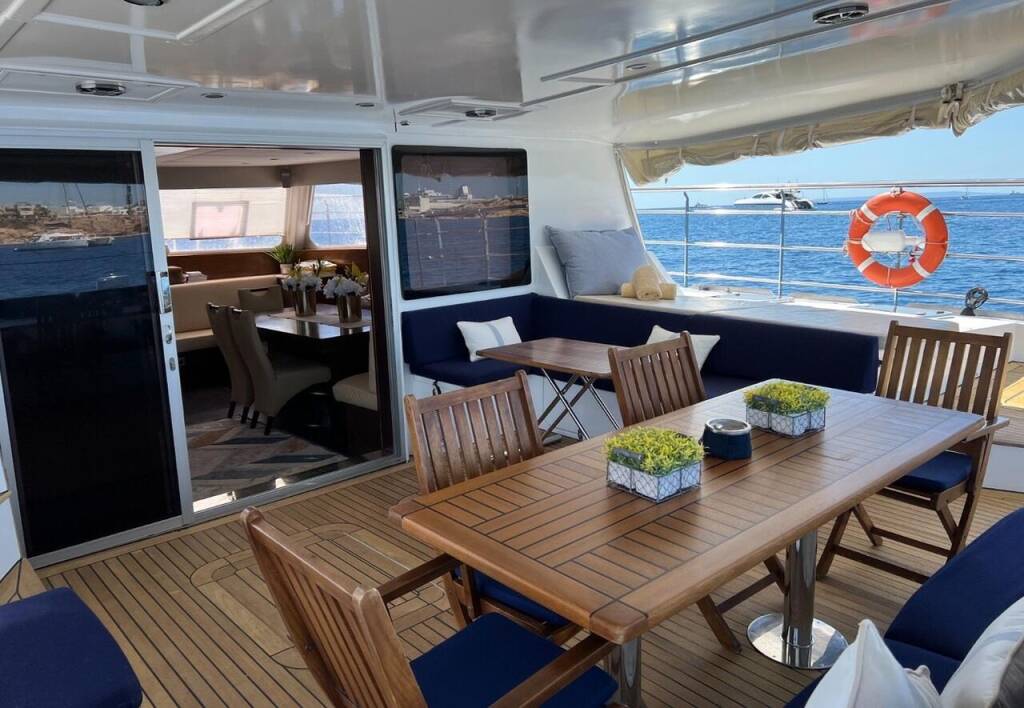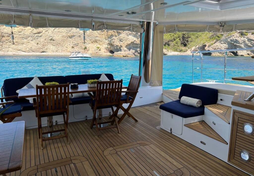 Katamaran Sunreef 62 Tekila, Baujahr 2008, liegt im Ibiza, Balearische Inseln, Spanien vor Anker. Es verfügt über 4 + 2 Kabinen und bietet Platz für 8 + 2 Personen mit 5 Toiletten.