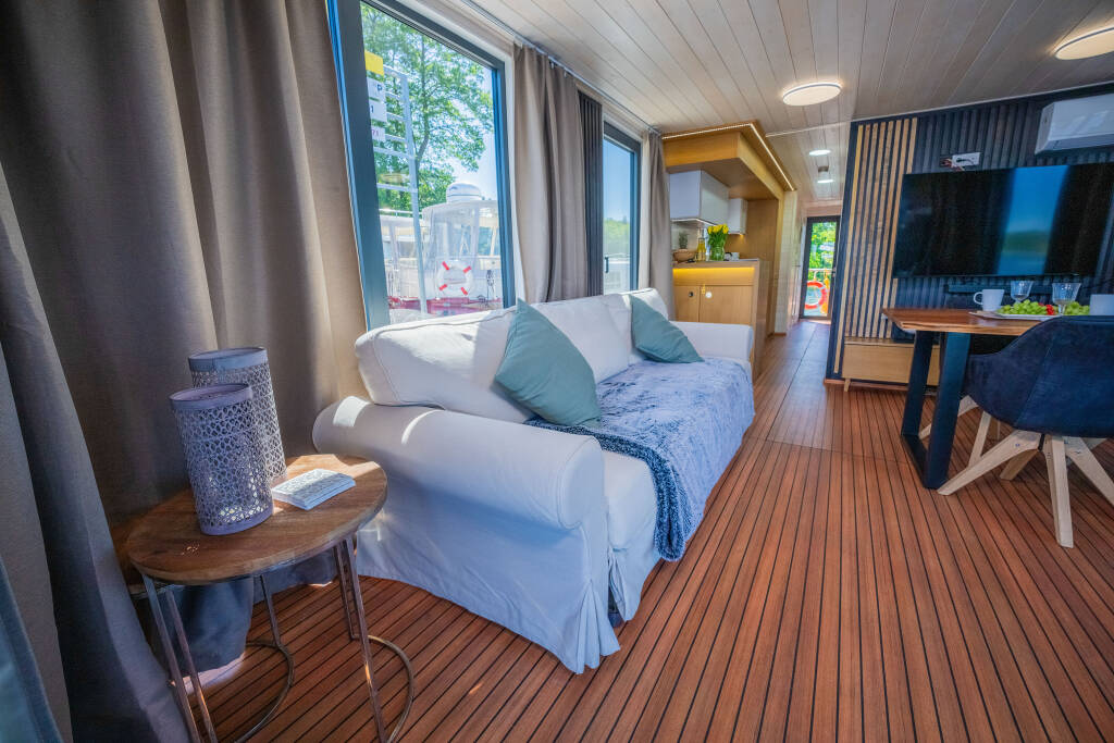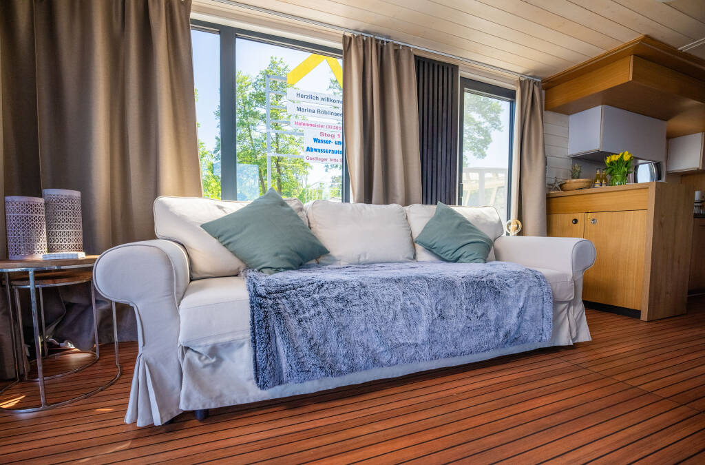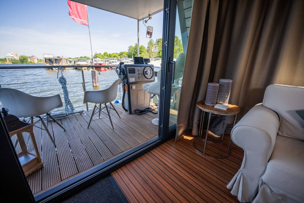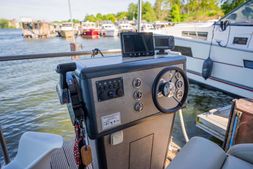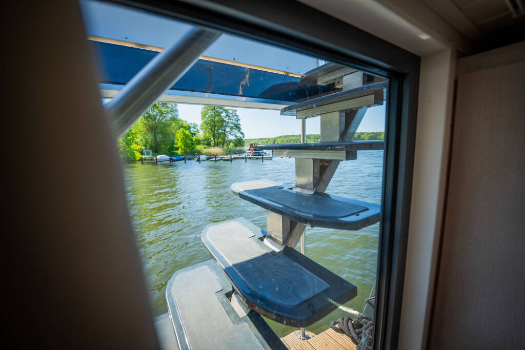 Motoryacht Woma D13 Ariella, Baujahr 2022, liegt im Röblinsee Marina, Brandenburg, Deutschland vor Anker. Es verfügt über 2 Kabinen und bietet Platz für 7 Personen mit 1 Toiletten.