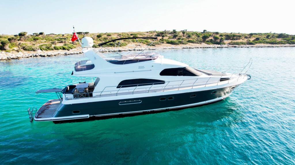 Motoryacht Zeus Zeus, Baujahr 2015, liegt im Bodrum Harbour, Aegean, Türkei vor Anker. Es verfügt über 2 + 1 Kabinen und bietet Platz für 4 + 2 Personen mit 2 Toiletten.