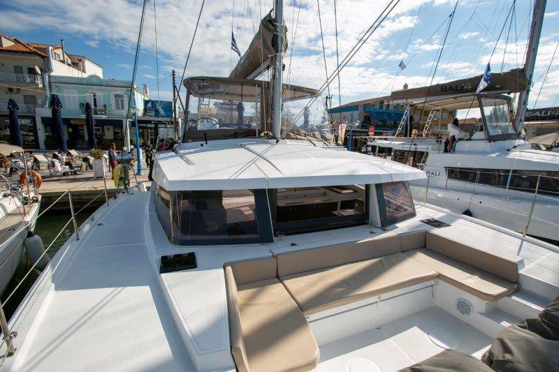 Catamaran Bali 4.1 Fortuna II, built in 2020 is anchored in the Piso Livadi Port, Paros, Cyclades, Greece. It has 4 cabins, can accommodate 8 + 2 people and has 4 toilets.