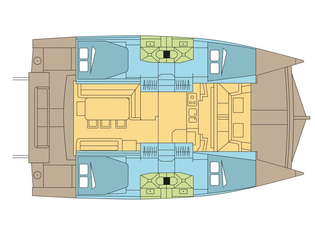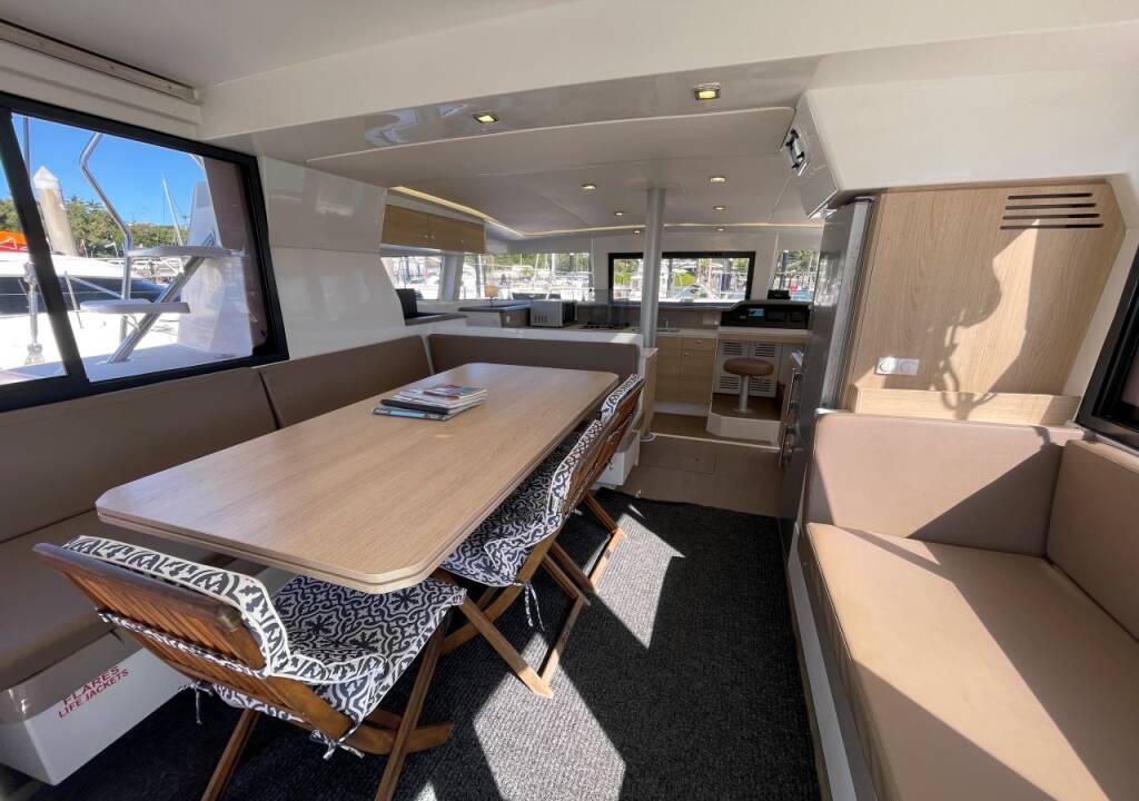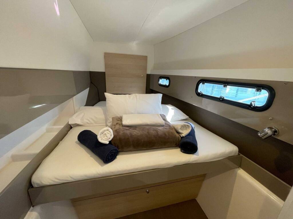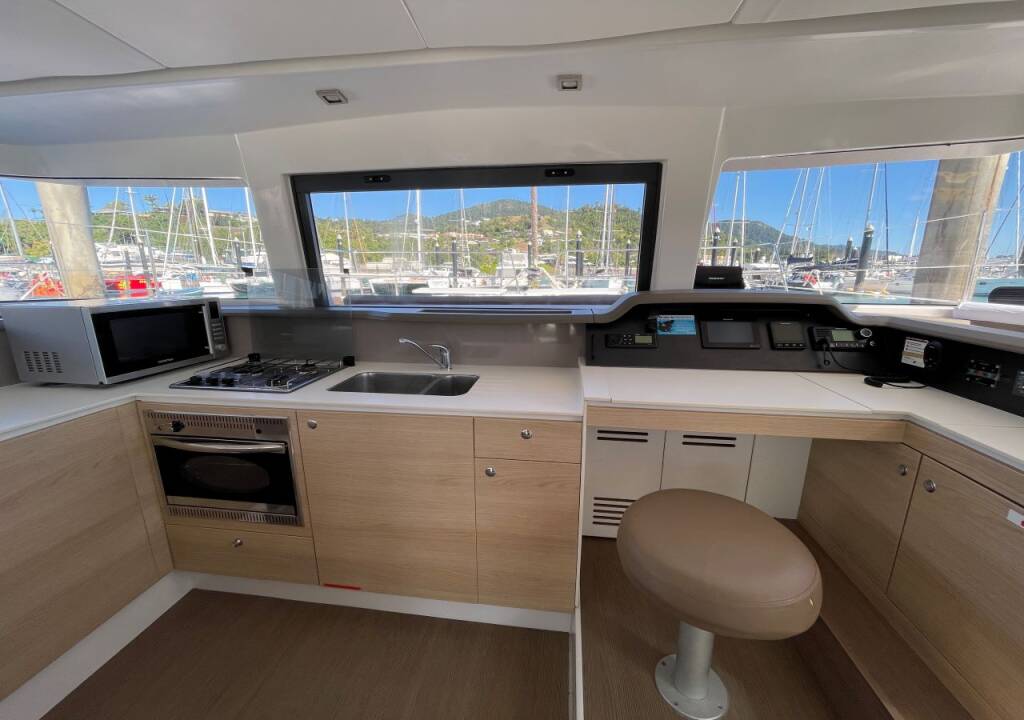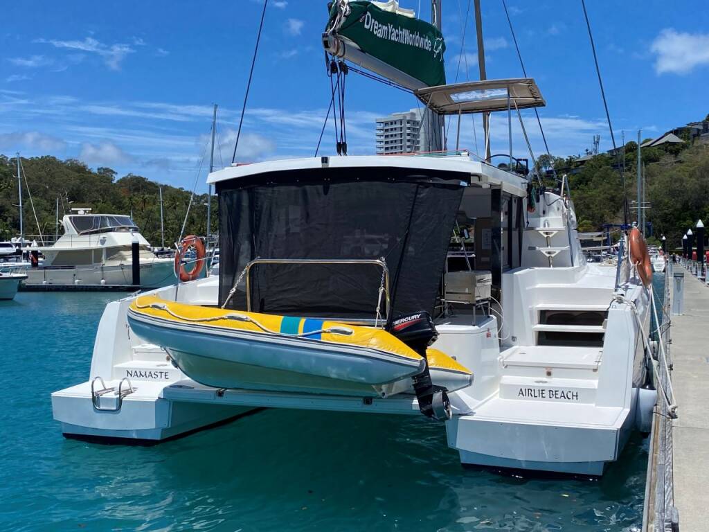 Catamaran Bali 4.1 NAMASTE_DB, built in 2019 is anchored in the Whitsundays, Airlie Beach, Coral Sea Marina, Whitsunday Region of Queensland, Australia and Oceania. It has 4 cabins, can accommodate 8 people and has 4 toilets.