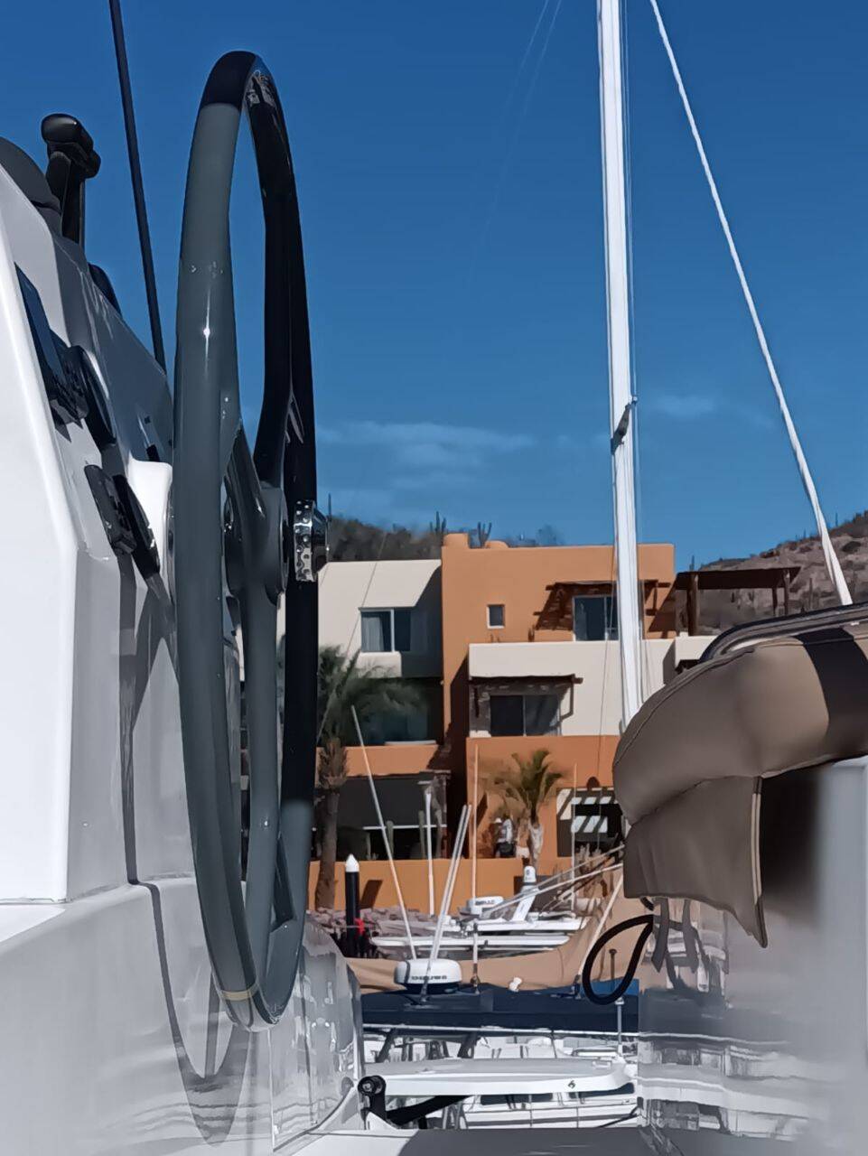Catamaran Bali 4.5 DIOGENES, built in 2017 is anchored in the La Paz, Costa Baja Marina, Baja California Sur, Mexico. It has 4 + 2 cabins, can accommodate 8 + 2 people and has 4 toilets.