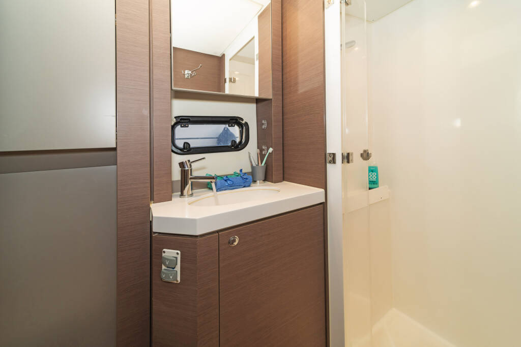 Catamaran Bali 4.6 Aria, built in 2025 is anchored in the Lefkas main port, Ionian Islands, Greece. It has 5 + 1 cabins, can accommodate 10 + 1 people and has 4 + 1 toilets.