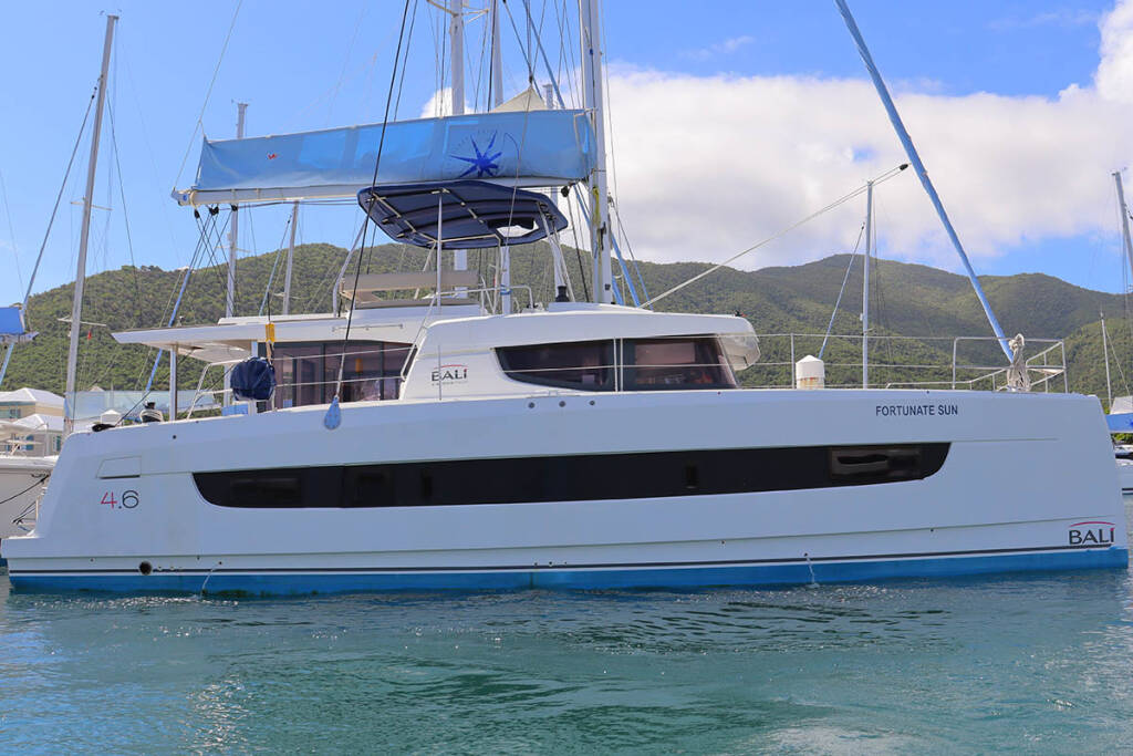Catamaran Bali 4.6 Fortunate Sun, built in 2022 is anchored in the BVI, Tortola, Nanny Cay Marina, British Virgin Islands, British Virgin Islands. It has 5 + 1 cabins, can accommodate 10 + 1 people and has 4 + 1 toilets.