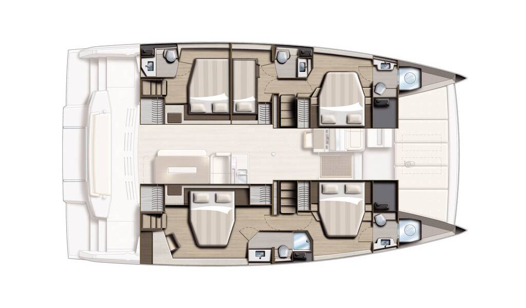 To date, the BALI 4.8 Open Space is the only catamaran of its size to offer a layout configuration in 5 cabins and 5 bathrooms. Never seen before, if the two forepeaks are fitted out and adding the bench seats in the saloon and a fly bridge that can comfortably accommodate lovers of stargazing. The super-sized interior space is completely "open" and "transforms", thanks to the large, motorized tilt-and-turn door that fully opens up the space in seconds, and the new forward door that provides access to the bows and forward cockpit with its lounge space and large sunbathing area, without having to use the external side-decks. The large, fully retractable front window and sliding side windows provide optimal ventilation and panoramic views of the outdoors. Another new feature, inherited is for increased privacy, access to the aft cabins (or central cabins depending on the configuration) which is via two large hatches opening into the aft cockpit. The companionways give easy and secure access to comfortable cabins with a warm atmosphere. The forward cockpit is big enough for the entire family to enjoy – no space goes to waste, or you can enjoy the 360 views from the flybridge equipped with sun beds and table. This beauty boasts two Yammer 80hp engines. On Point has air conditioning throughout with a generator and solar panels, roller furling and electric winches. She has a beautifully efficient well-equipped galley with a full-size refrigerator & freezer, 4 burner stove, oven, microwave oven, blender and your choice of a French press, percolator or electric coffee maker for coffee. She boasts standard U.S. plugs throughout with 110 systems, electric freshwater heads and a propane BBQ grill. Her amenities include a stereo with Bluetooth capabilities with auxiliary input and inverter for charging your cell phones, etc. She holds 211 gallons of fuel, 260 gallons of water and draws 4 ft, 5 inches.