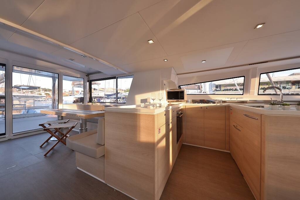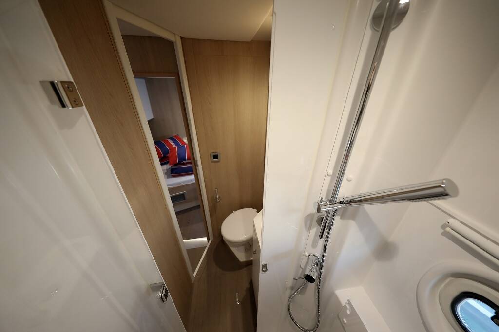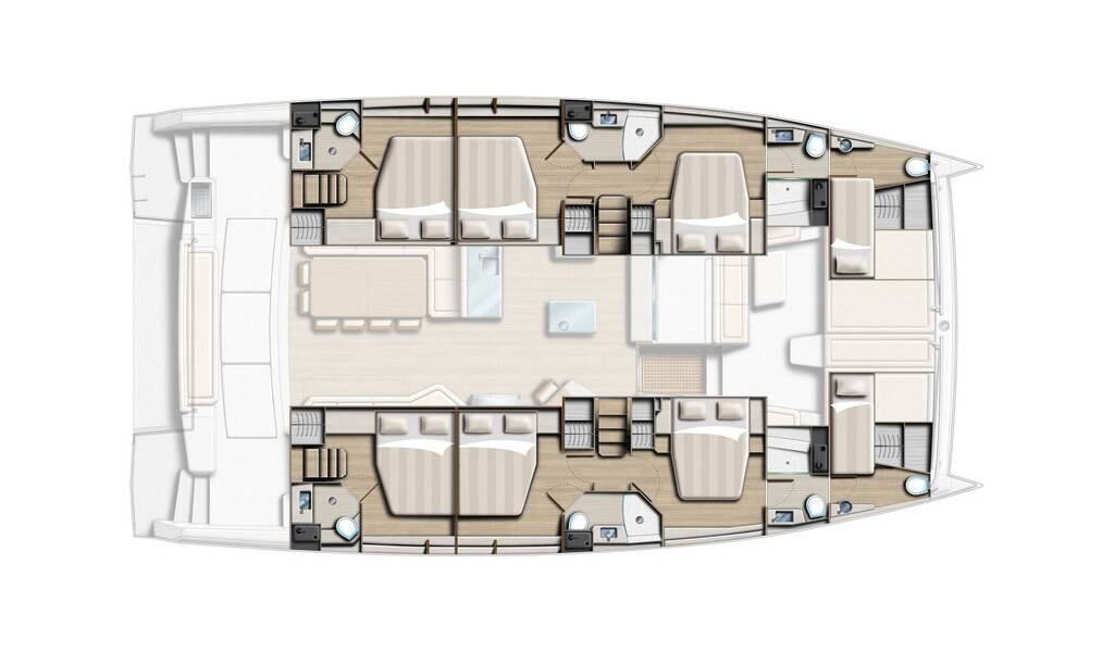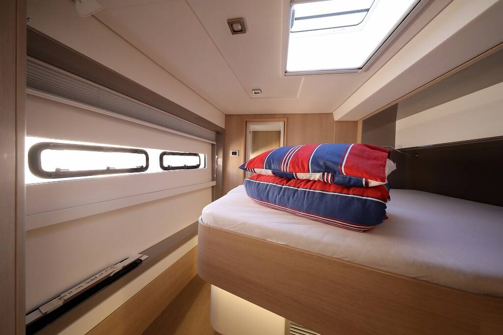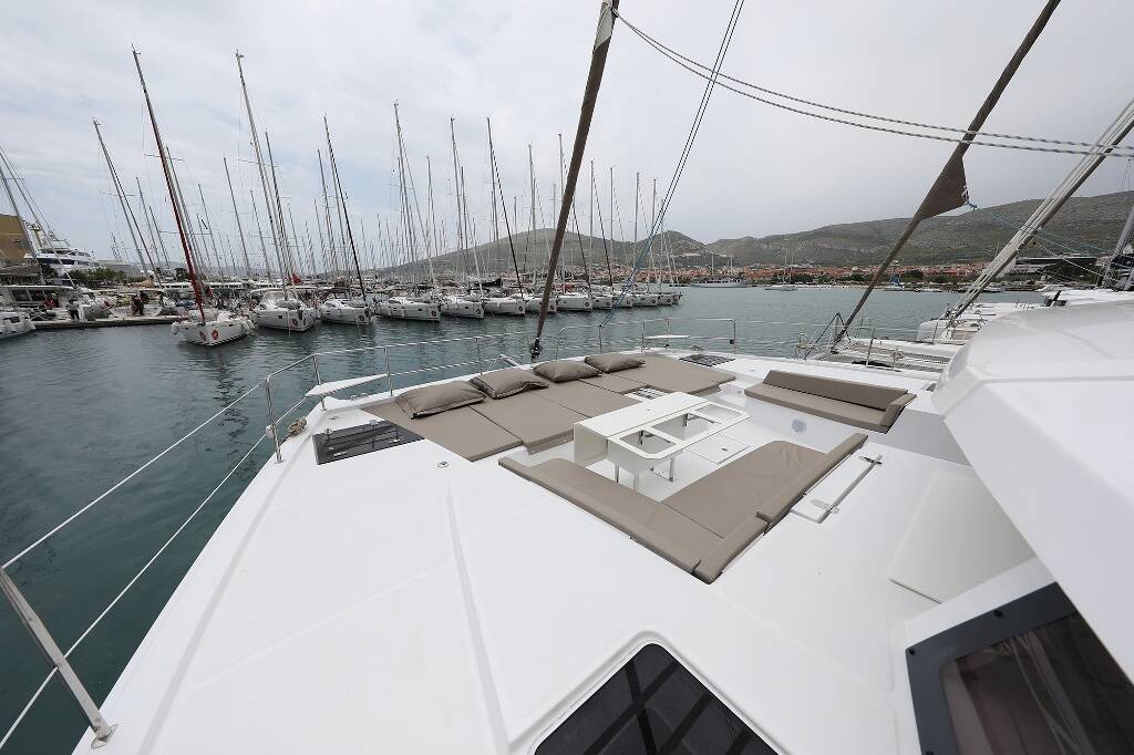 Catamaran Bali 5.4 Lalounge, built in 2019 is anchored in the Marina Frapa, Rogoznica, Šibenik region, Croatia. It has 6 + 2 cabins, can accommodate 12 + 1 + 1 people and has 8 toilets.